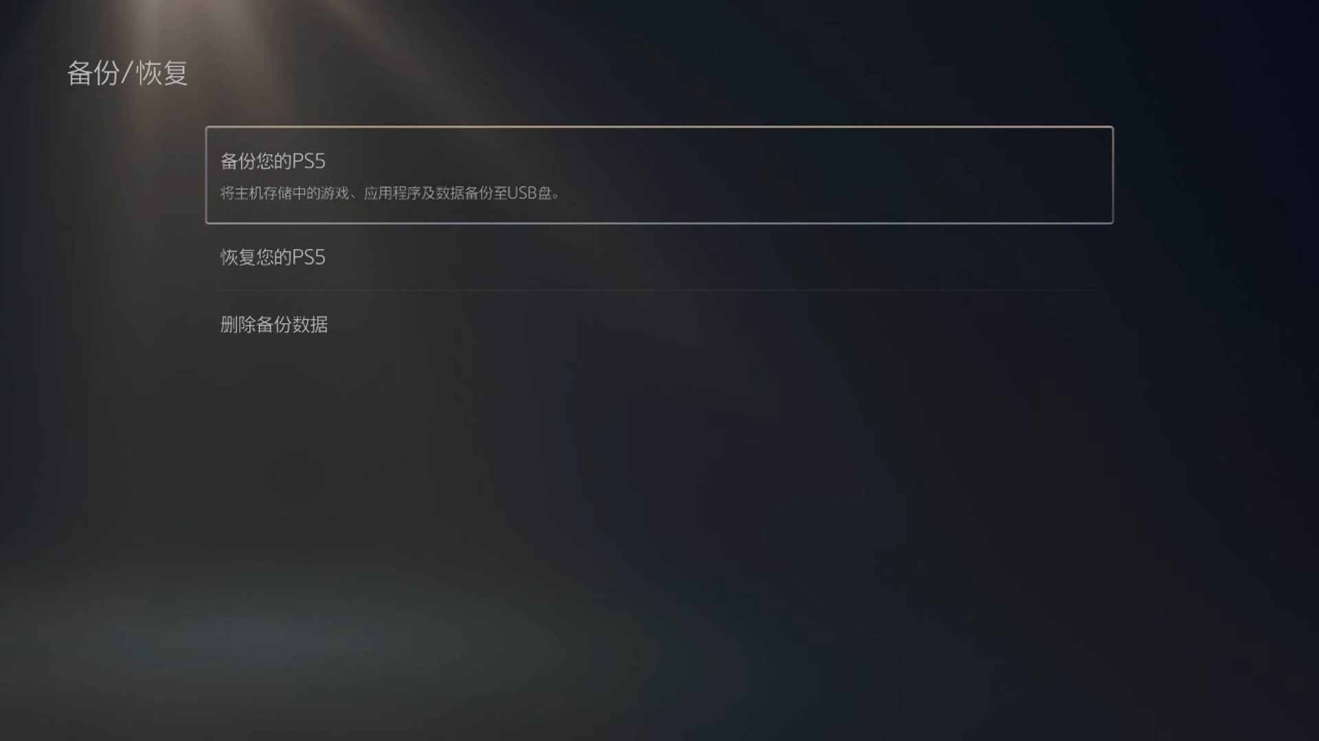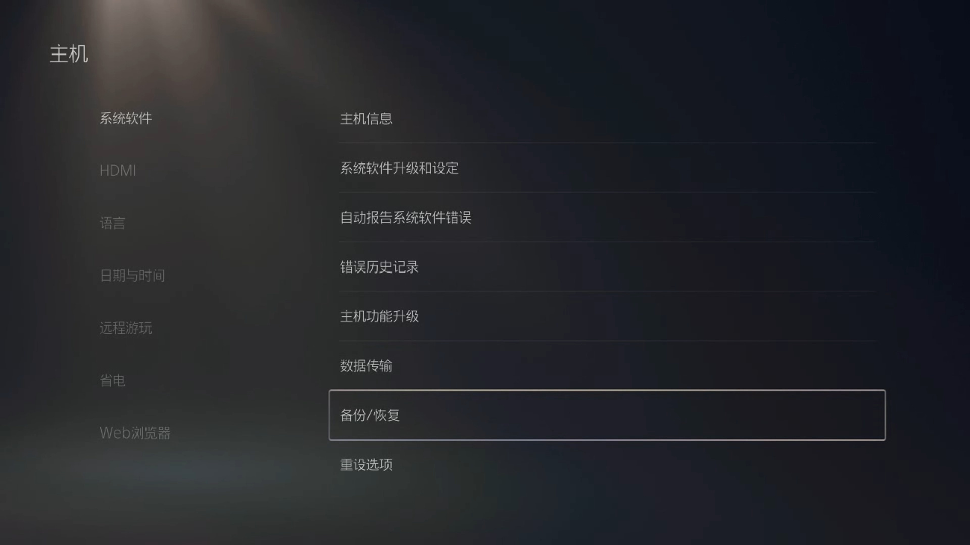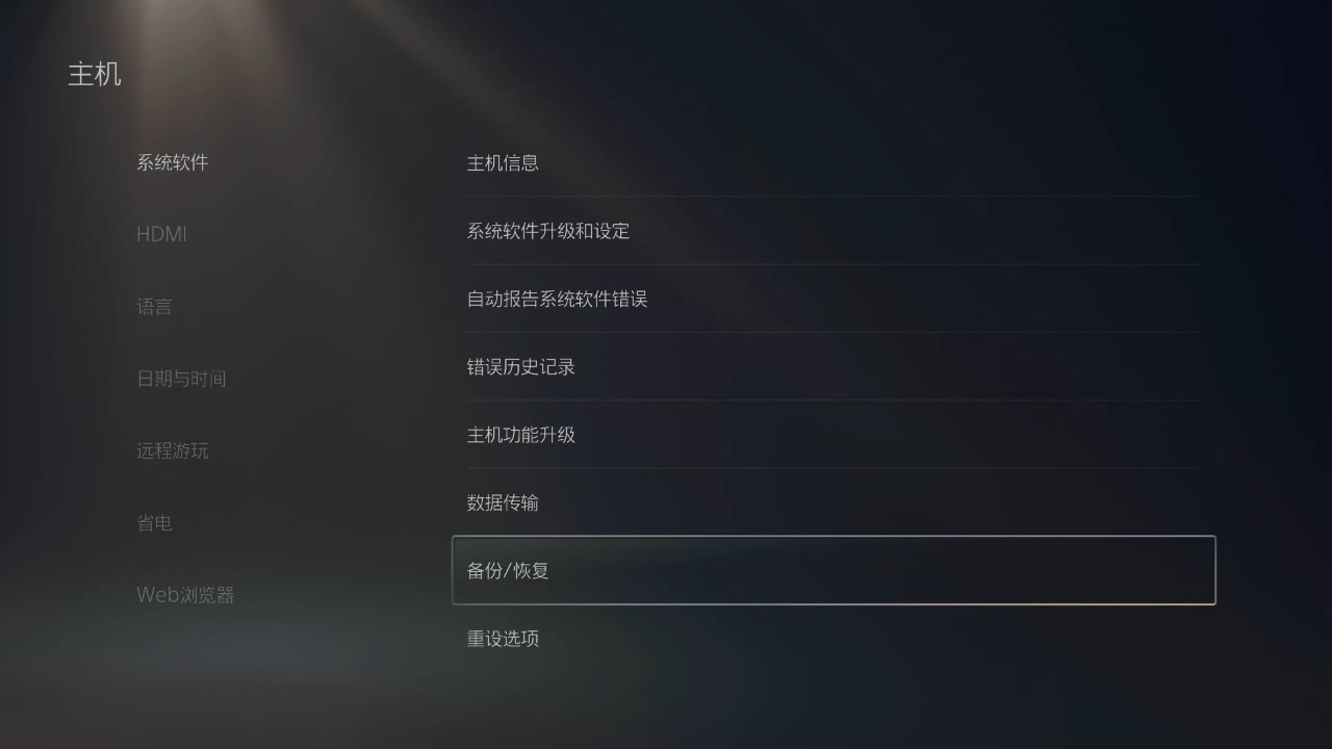 在備份機中登陸好外服賬號後,將U盤插入,進入設定選項,選擇主機-系統軟件-備份/恢復-備份您的PS5。