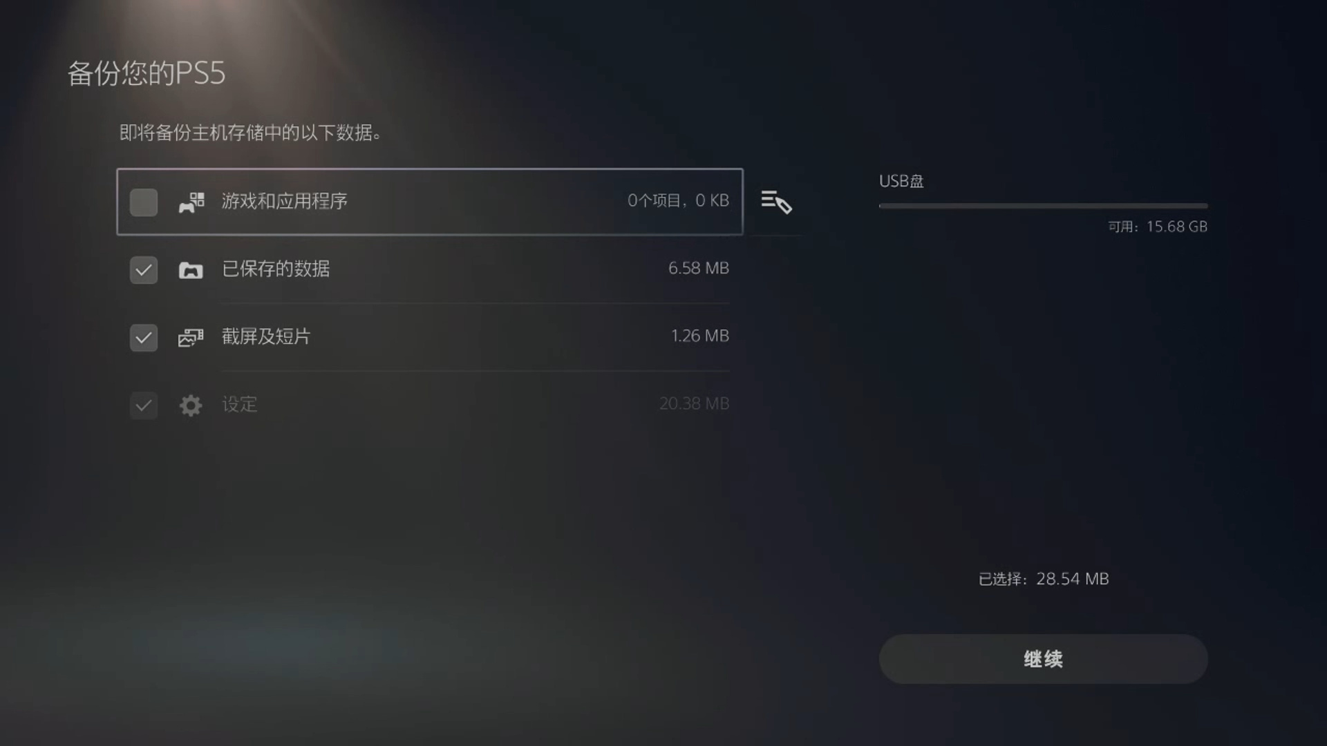 選擇需要備份的內容,建議只備份設定與數據。點擊繼續後,PS5會重啓幾次,之後整個備份過程就完成了。