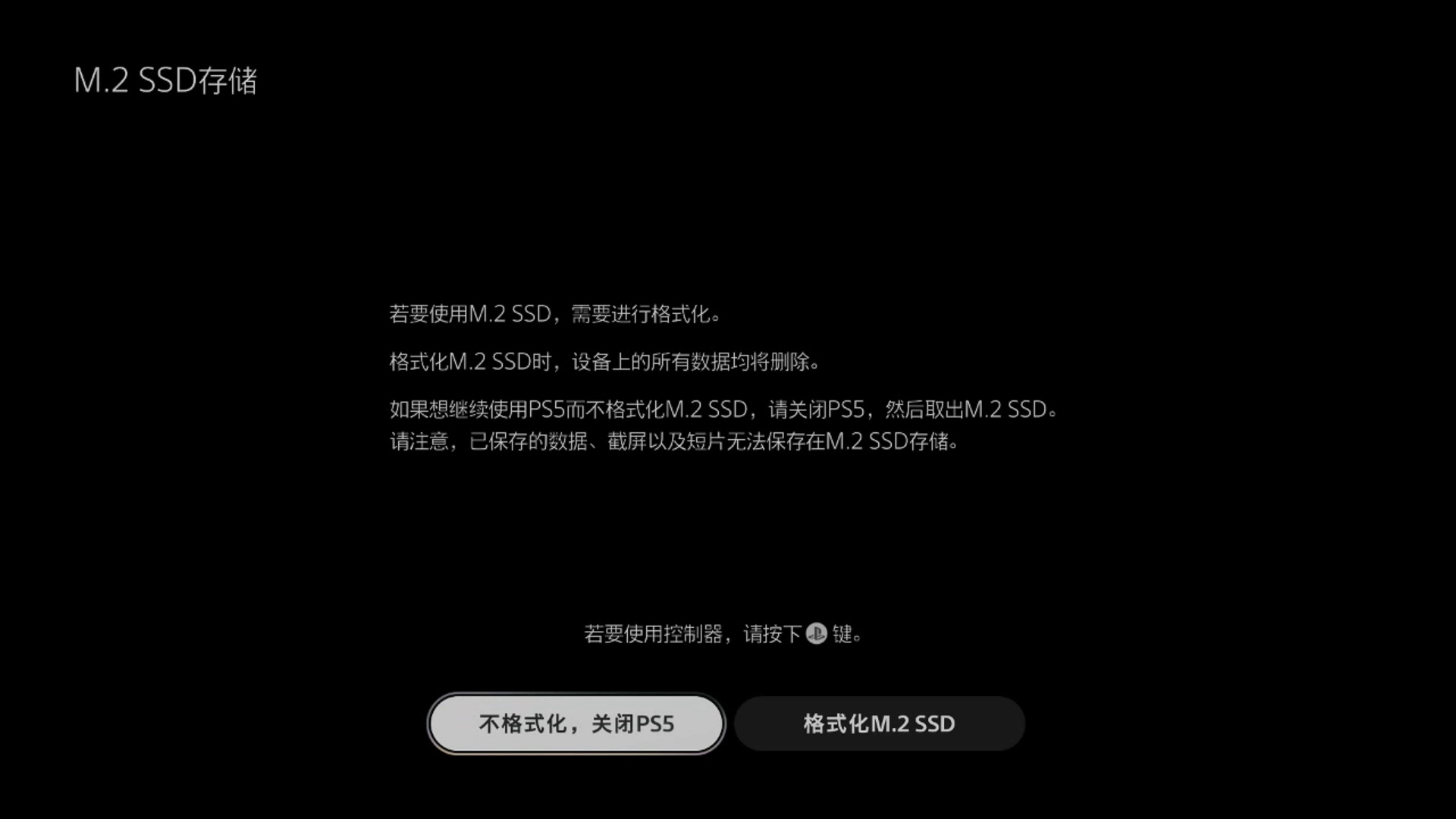▲將蓋板裝回後連接電源開機,PS5識別到了SSD,此時選擇格式化SSD並等待系統重啓開