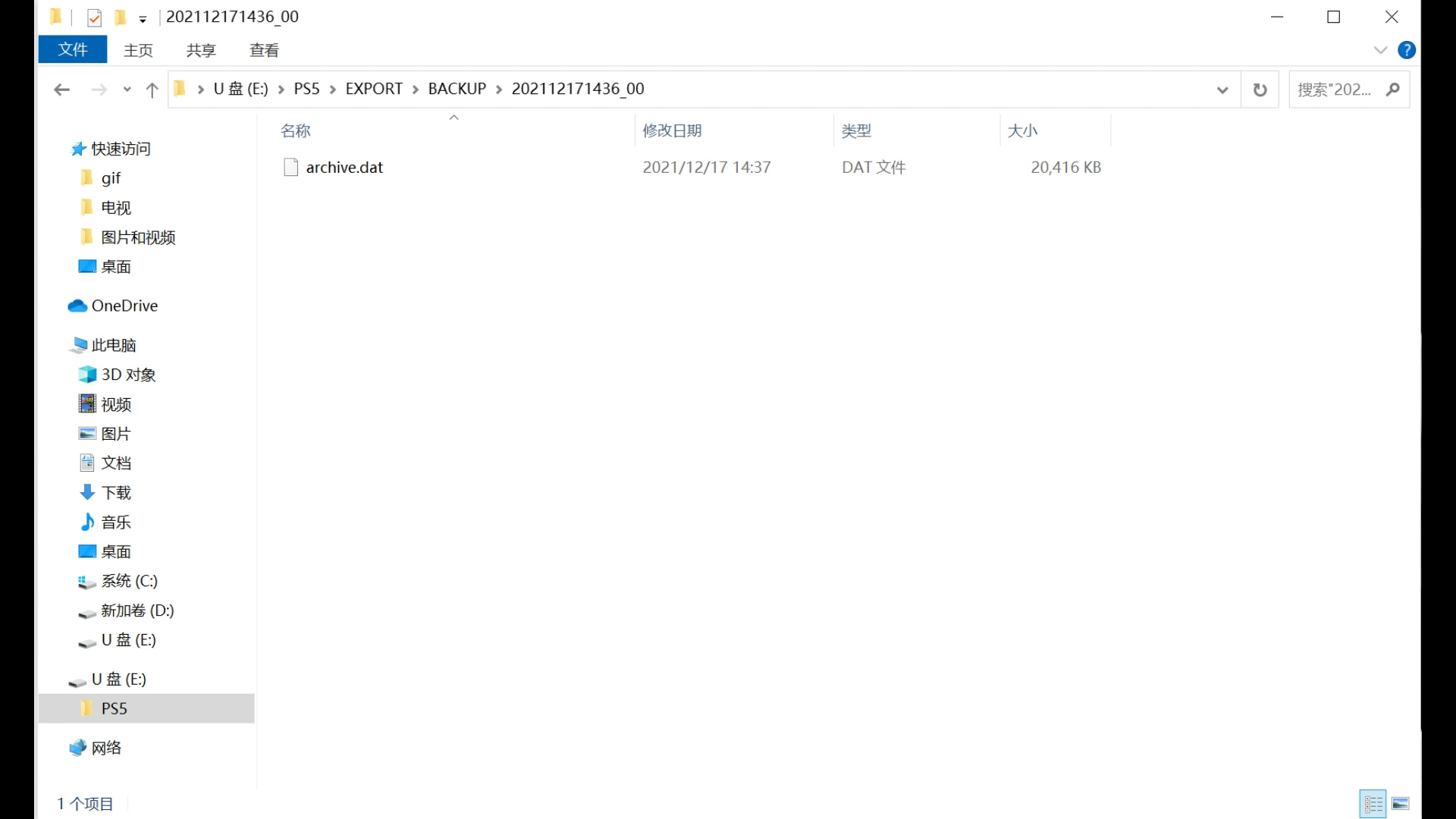 之後將備份文件拷貝進U盤中,其路徑爲U盤根目錄/PS5/EXPORT/BACKUP/時間戳/archive.dat
