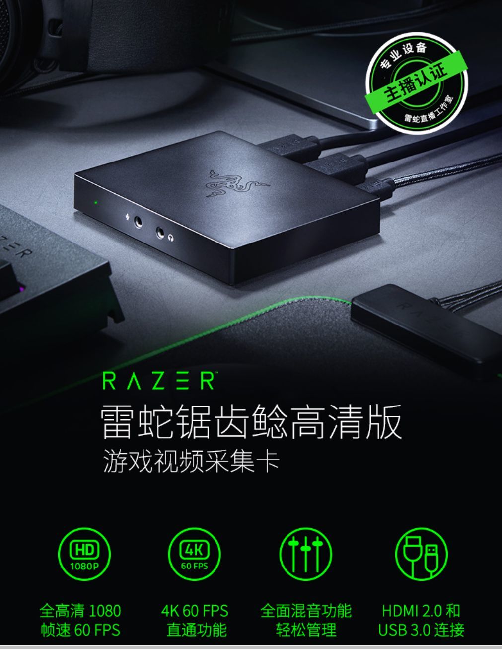 與之性能大概相同的還有這款雷蛇的鋸齒鯰高清版,同樣支持4K 30Hz錄製與4K 60Hz環出。