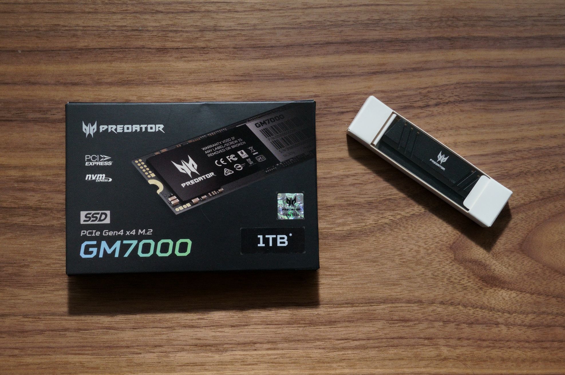 這裏我選擇的是宏碁掠奪者 Predator的GM7000固態硬盤,我的是1TB的版本,其官方標稱的讀寫速度分別爲7400MB/s與6400MB/s。其中7400MB/s的順序讀取速度在目前的PCIe 4.0固態硬盤種屬於絕對的第一匹隊。另外,Predator GM7000採用12nm先進製程主控,PCB佈局更緊湊,並附贈定製石墨烯導熱墊和金屬散熱馬甲,能夠有效降低SSD功耗及發熱量,所以十分適合作爲PS5的擴容盤。