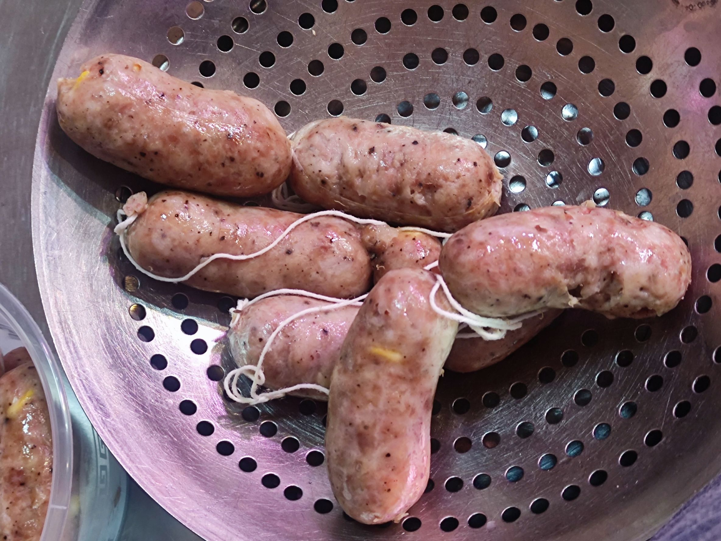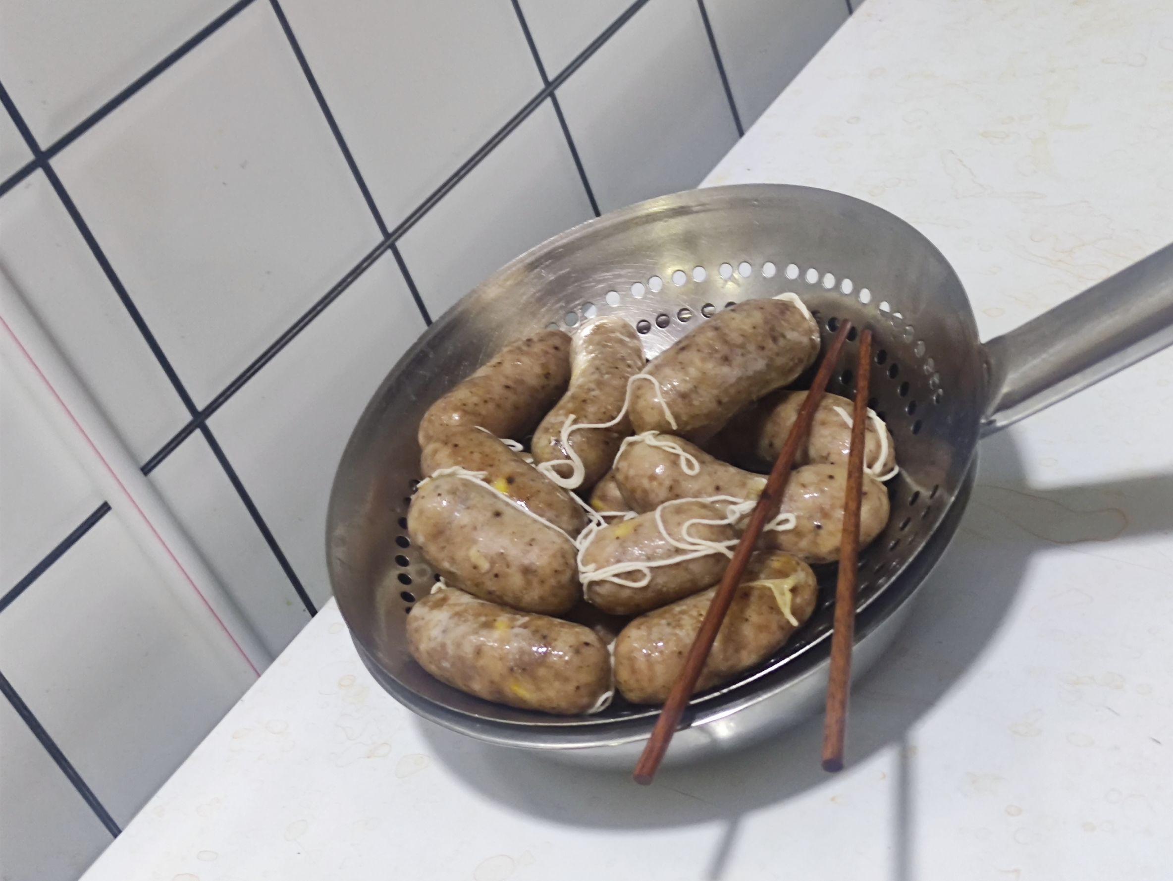 步骤四:风干过后,把肉肠凉水下锅,开中火,煮到肉肠浮起来就熟了,如图所示