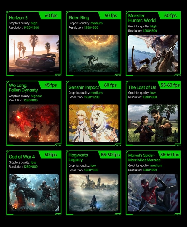 1280×800分辨率下,《艾尔登法环》中画质、《怪物猎人:世界》高画质、《最后生还者》低画质、《战神4》低画质、《霍格沃茨之遗》低画质、《蜘蛛侠:迈尔斯·莫拉莱斯》中画质都能跑到或者逼近60FPS。