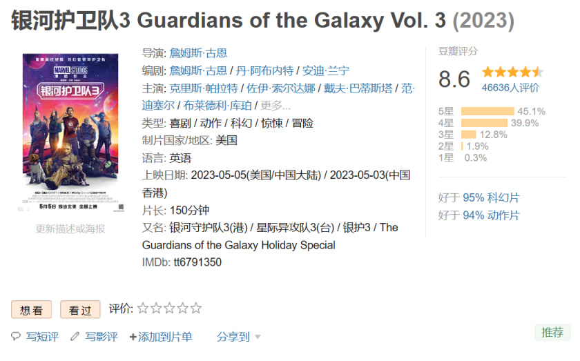 而本片在國內知名評分網站豆瓣的評分爲8.6分,將近半數的人給出了5星好評!由此可以看出《銀河護衛隊3》與同期其它漫威影業出品的電影作品在評分上的兩級分化