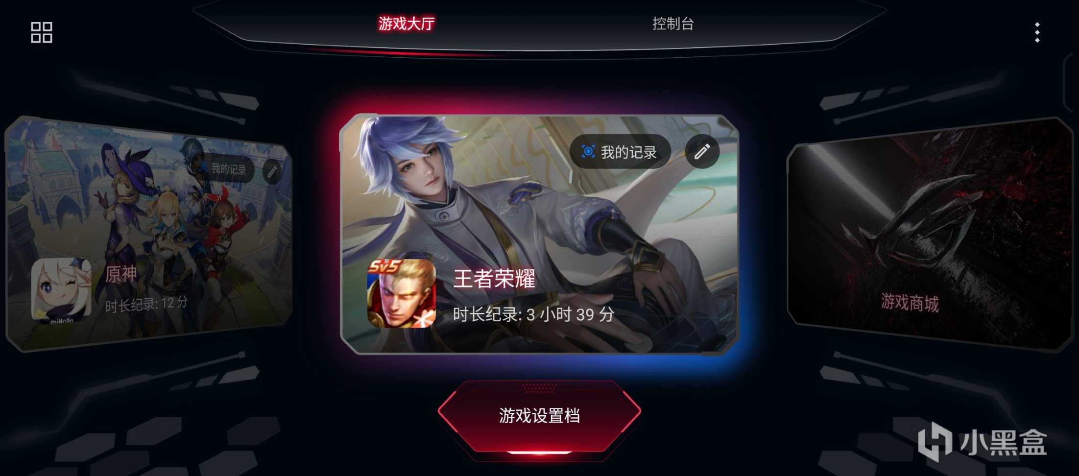 这是手机中展示所有游戏的位置,相当于一个游戏“收纳盒”,可以针对不同游戏选择不同场景设置,比如原神就直接拉满,比如小的像素游戏就可以降低到安静模式的性能。