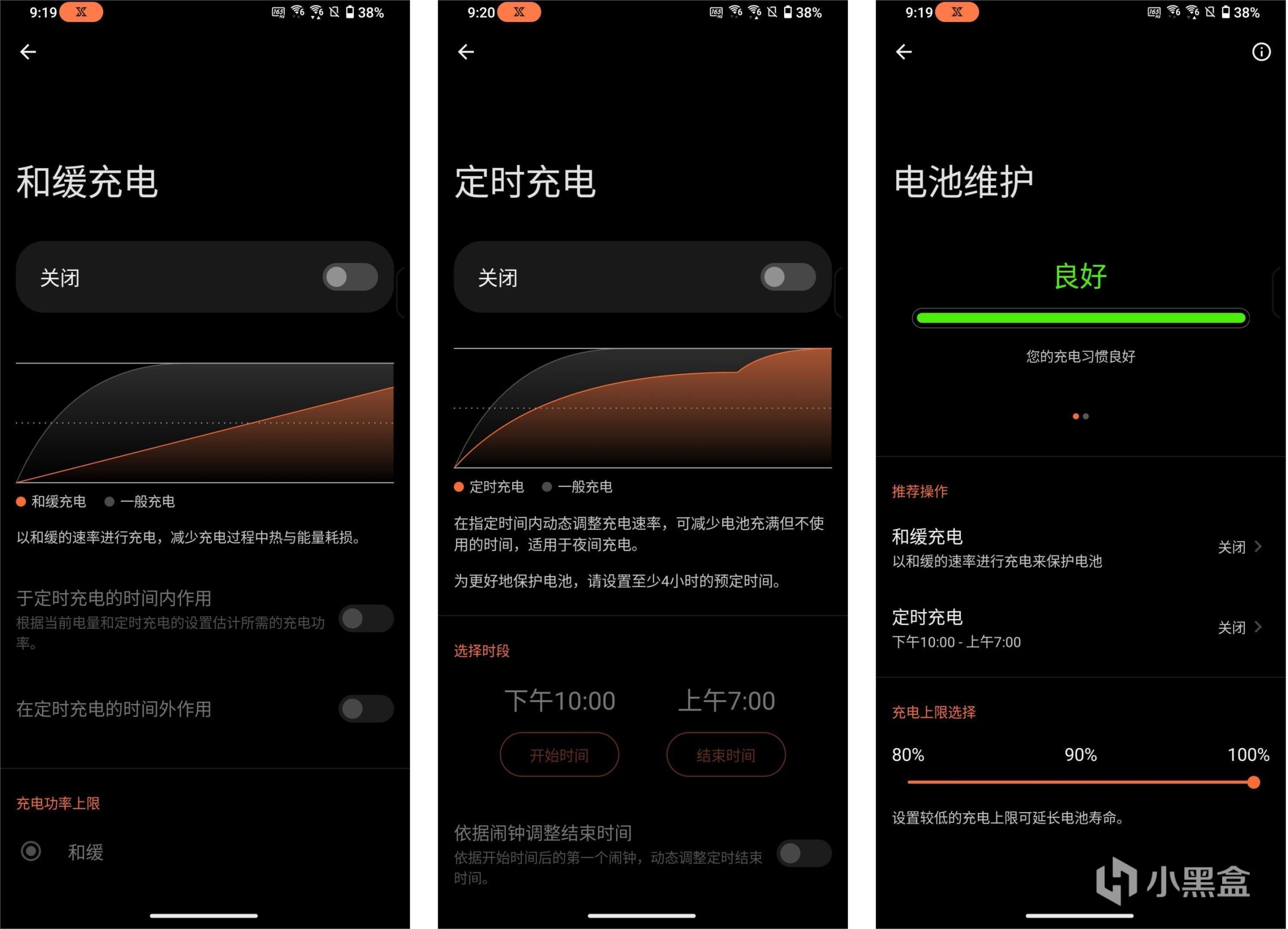 和缓充电:提供三档(关闭、和缓、极度和缓)供用户选择,有效降低充电温度并延长电池寿命