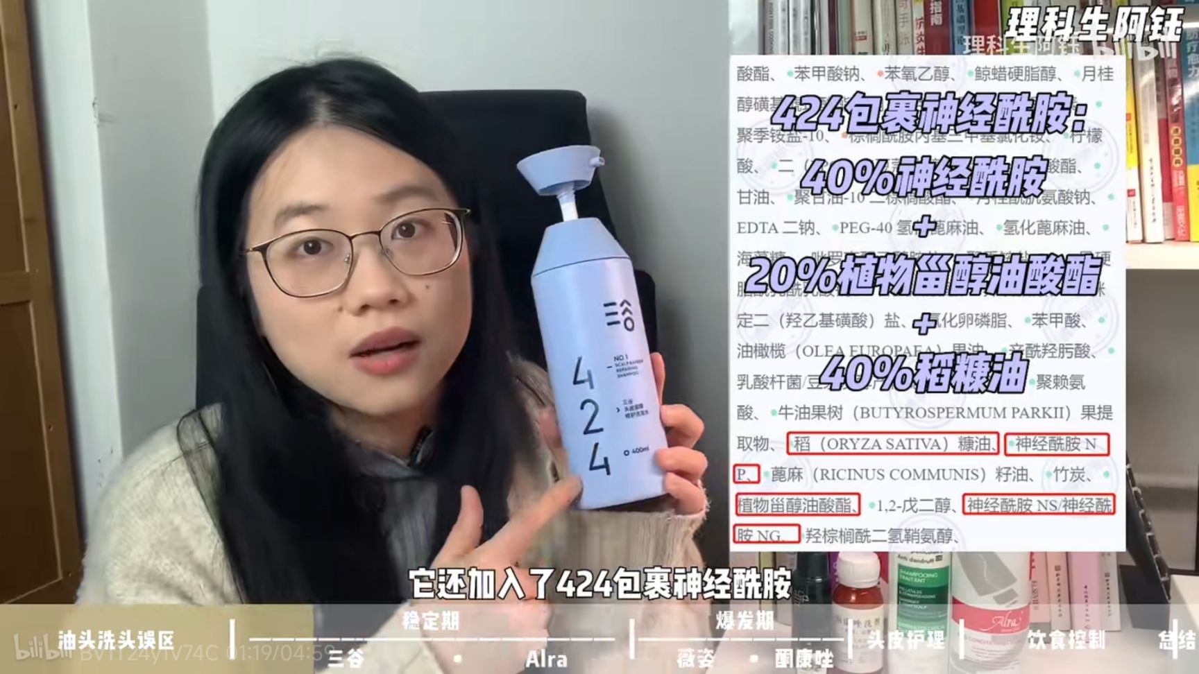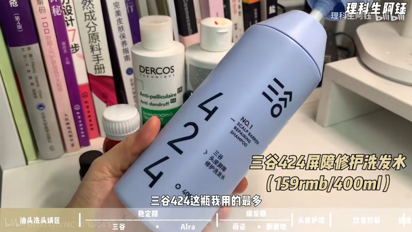 這個up主在視頻裏首先推薦的是三谷424屏障修護洗髮水,這款主要是主打屏障修護。很多人頭油可能就是因爲頭皮清潔過度,或者之前的洗髮水用的不對,造成頭皮受損就越來越油。這款洗髮水的價格大概100左右,我是沒有買這瓶買了薇姿綠標,所以大家可以根據需求選擇,看一看商品詳情和評價再選擇入手。