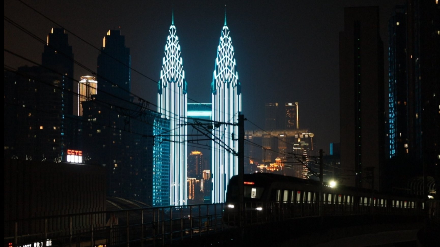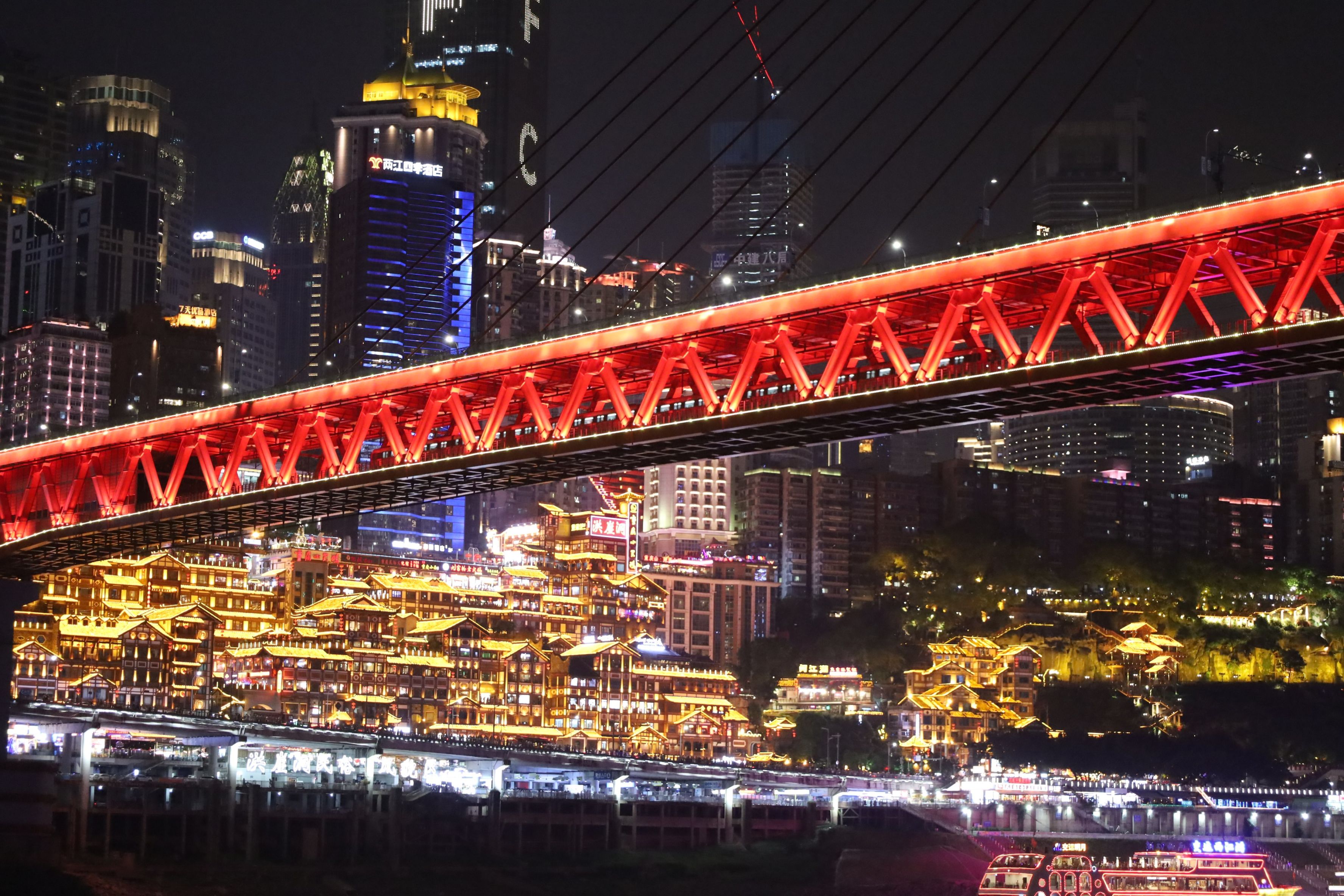 千厮门大桥和洪崖洞联动,正好抓拍到桥上驶过的轻轨
