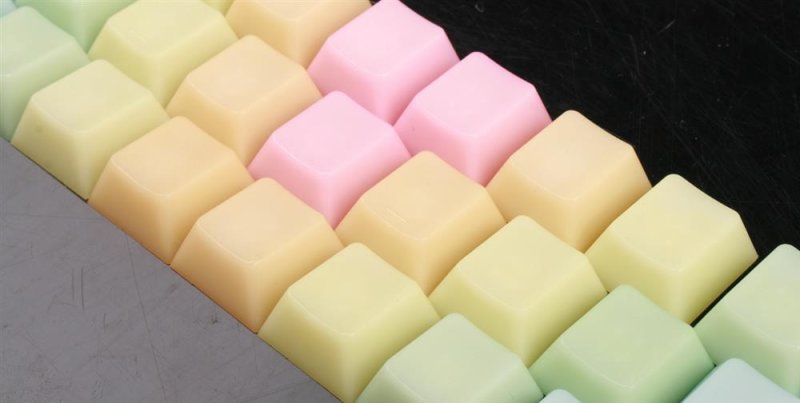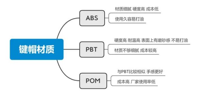 ABS:因爲成本低廉,是廠家使用率較高的材質,材質本身強度高,可塑性強,容易上色。所以ABS材質顏色都會比較鮮亮,厚度比較薄打擊感與透光性都很不錯,很適合搭配背光。不過該材質使用時間久了比較容易打油,無論是手感或者顏值都會下降,由於耐熱度較差無法使用熱昇華刻字,所以表面的字體也會因爲打油而慢慢消失。