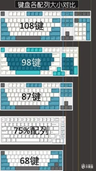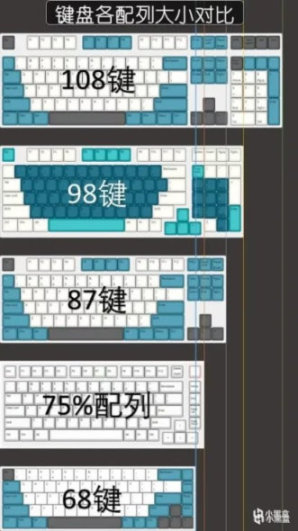 我們通常將鍵帽的寬度以u爲單位,以最短的鍵帽爲1u(比如A/5/F4),以此類推,108配列的CTRL/WIN/ALT之類的鍵帽爲1.25u,空格爲6.25u。而其他配列鍵盤,則是在108配列的基礎上進行刪減(參考Q3),爲了保證整體佈局規範美觀,則將鍵帽寬度(高度)進行修改,會在108鍵基礎上增加許多增補鍵帽,一般除標準108、87、61配列之外均需要購買全套鍵帽