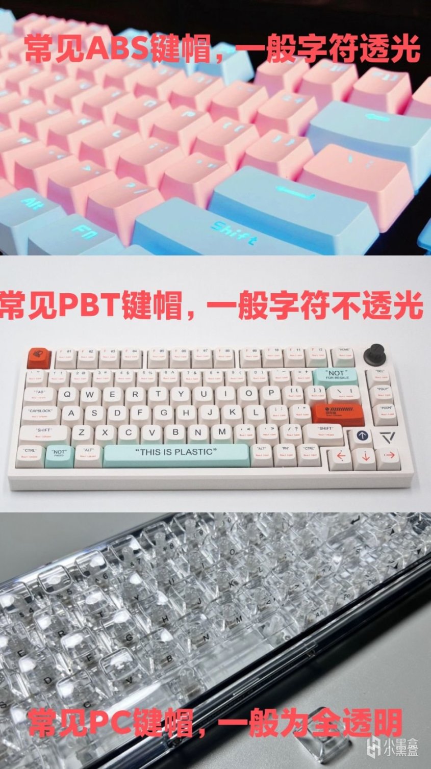 ABS材質本身具有成本低,強度高,韌性好,加工方便等優點,所以常見於百元的入門級機械鍵盤,並且手感細膩,色彩豐富也是他的特點。但同時缺點就是其抗打油性遠不如PBT材質。
