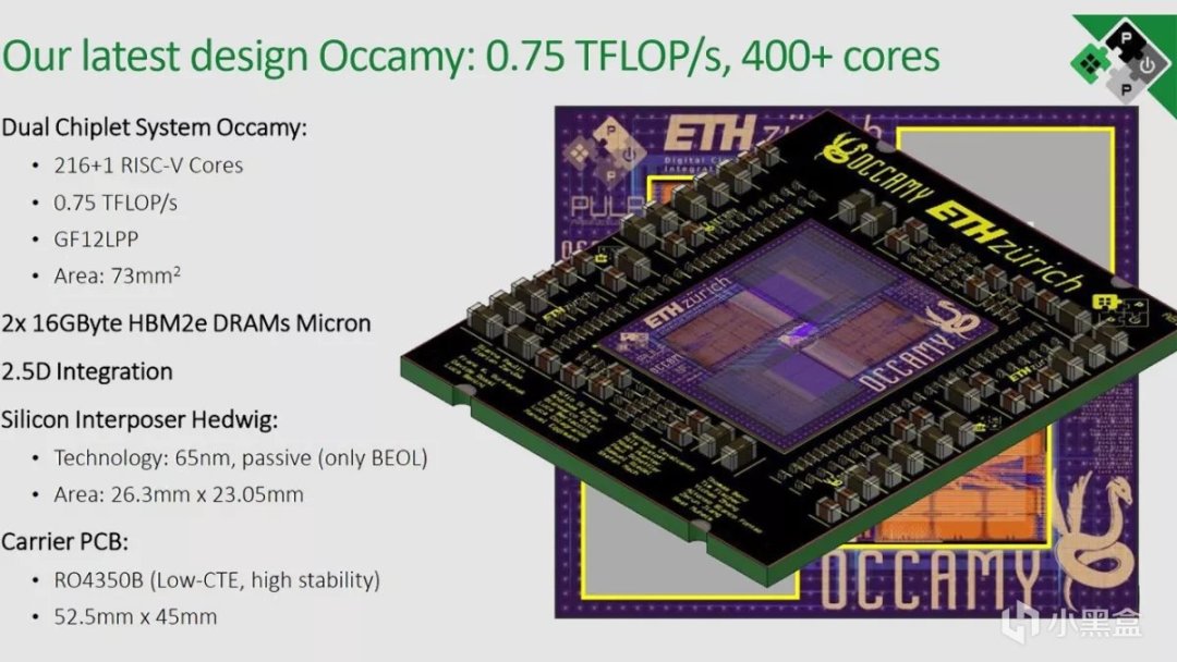 这颗处理器叫做Occamy,采用chiplet架构,432个RISC-V核心,带有AI加速器,配备32GB HBM2E内存,而且已经流片
