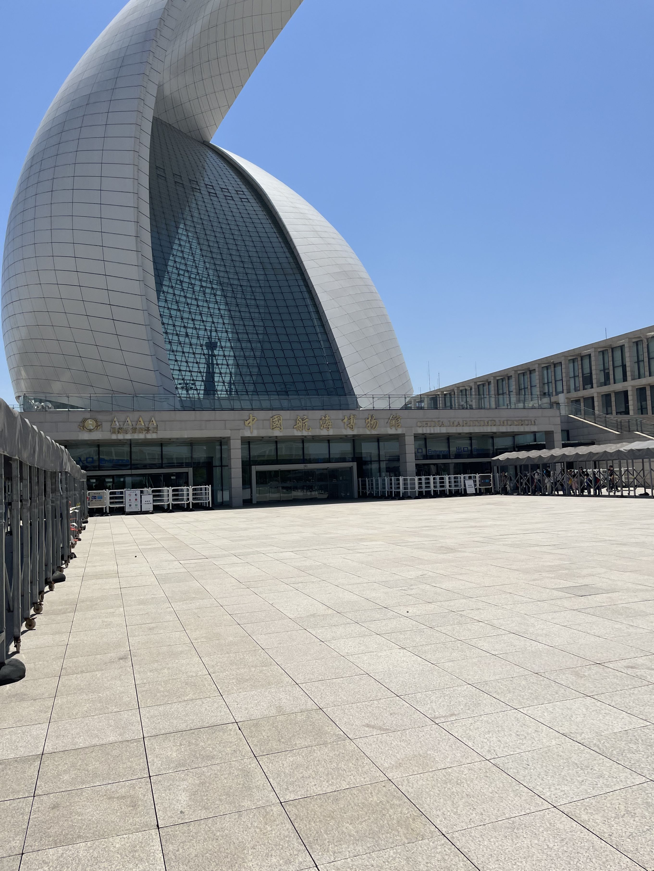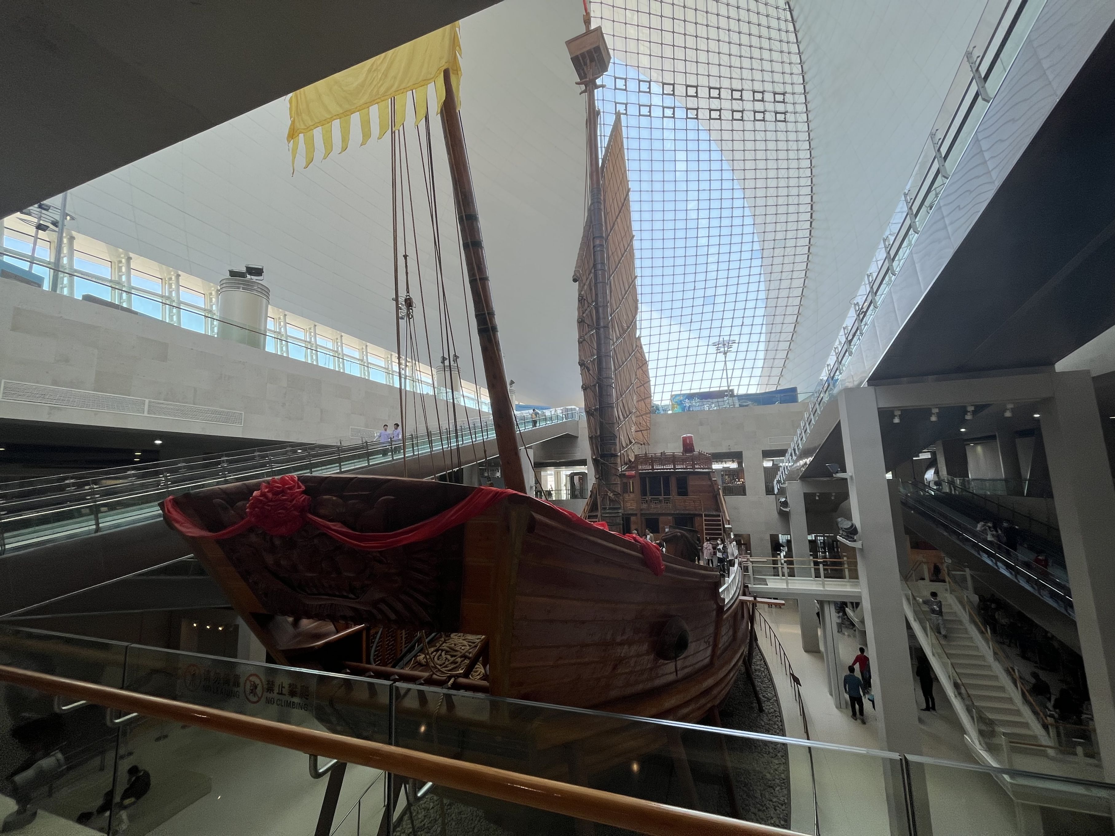 场馆很大,一层有传统木船建造和现代造船馆、船舶结构与设备馆、海员馆、海洋展区、航海史展区、第一临展厅等。二层有海上安全馆、海事馆、航海体育与休闲区、军事航海馆等,还有买纪念品的文创中心,我买了一个船舵模型。三楼本来是风帆厅,但我们去的时候看到了中韩合办的一个航海主题文化展。