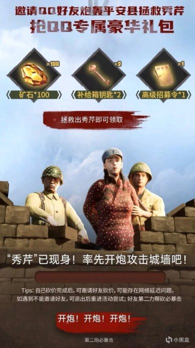 至於這張“邀請QQ好友炮轟平安縣城”的宣傳圖,這就更辣眼睛了。就算是思考了半輩子各種抗日方式鬼點子的李雲龍同志,也絕不會想到“好友幫砍”這種拼夕夕式線下拉人拼團抗日...