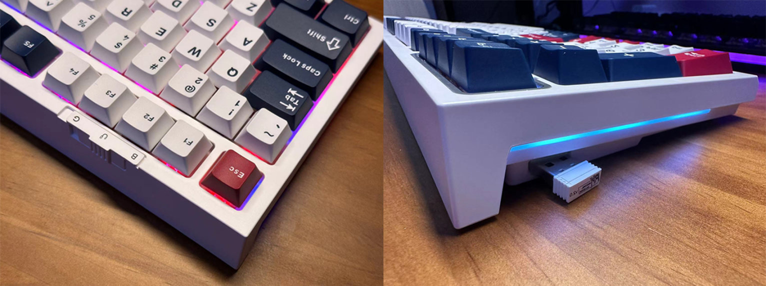 键盘的开关放在了键盘左上角位置,还是比较顺手的一个位置。而磁吸2.4G放在了键盘右侧位置。而键盘的侧面分别有2根导光条的,拍照好看把,我现在是对于灯光这方面是没需求的。