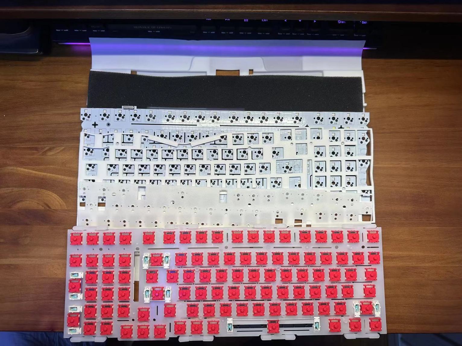 --PCB板:采用单键开槽白色PCB,支持3脚/5脚热插拔,基本满足了市面上的所有轴体,而单键开槽在量产98键盘中RK是目前独一家,这样做的原因是让键盘更加软弹,让声音一致性更高;