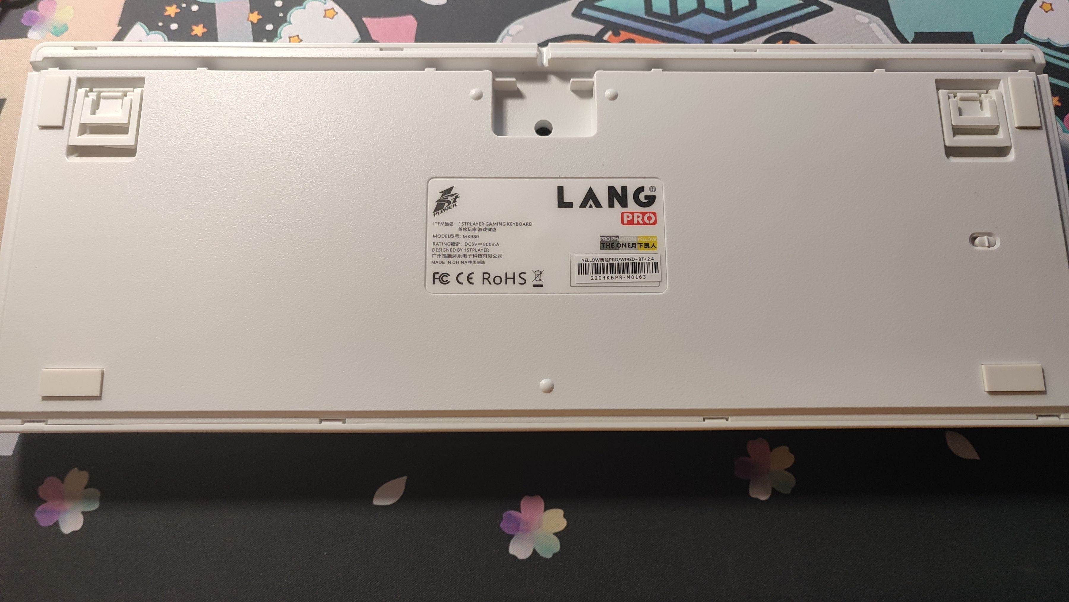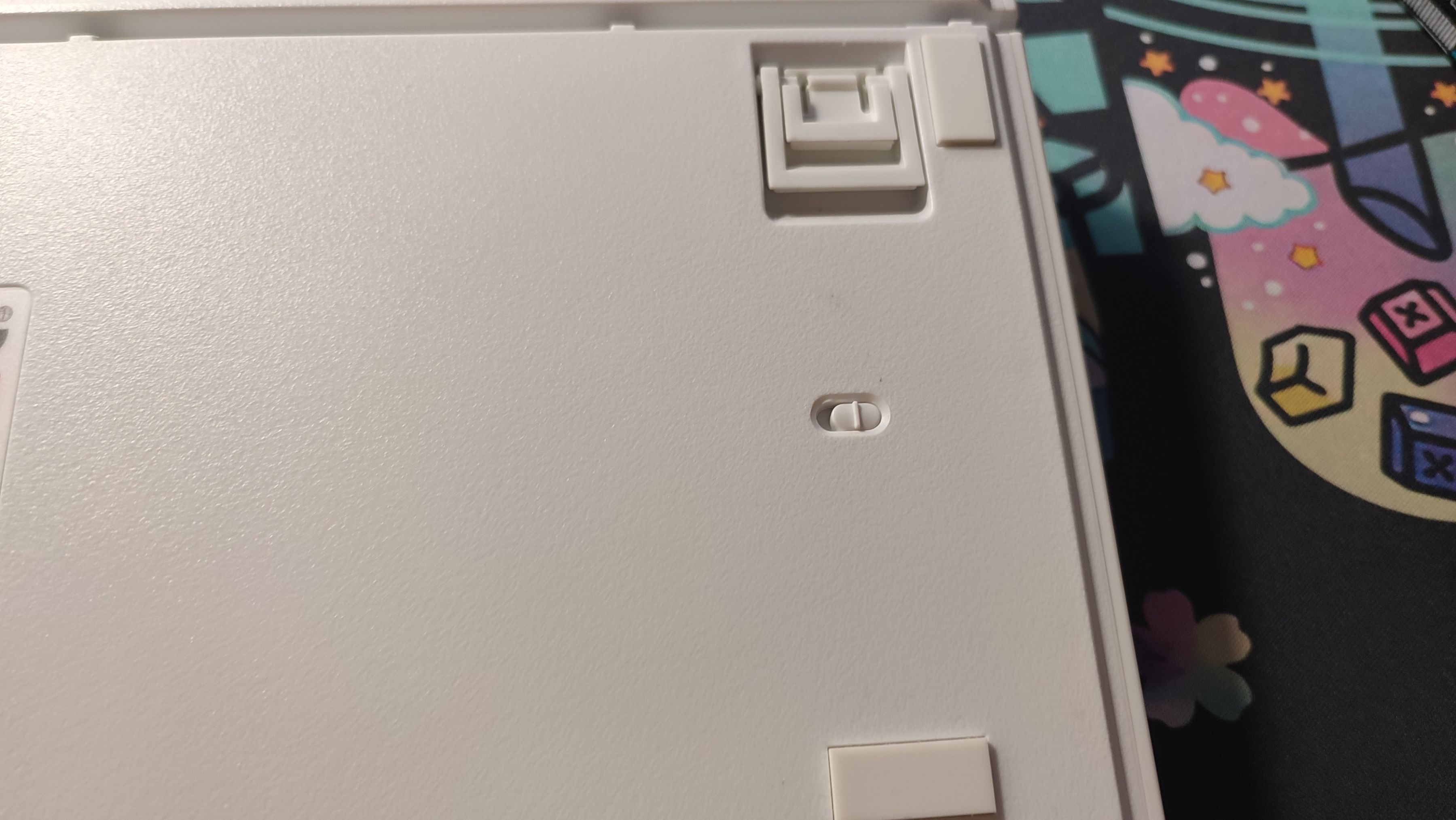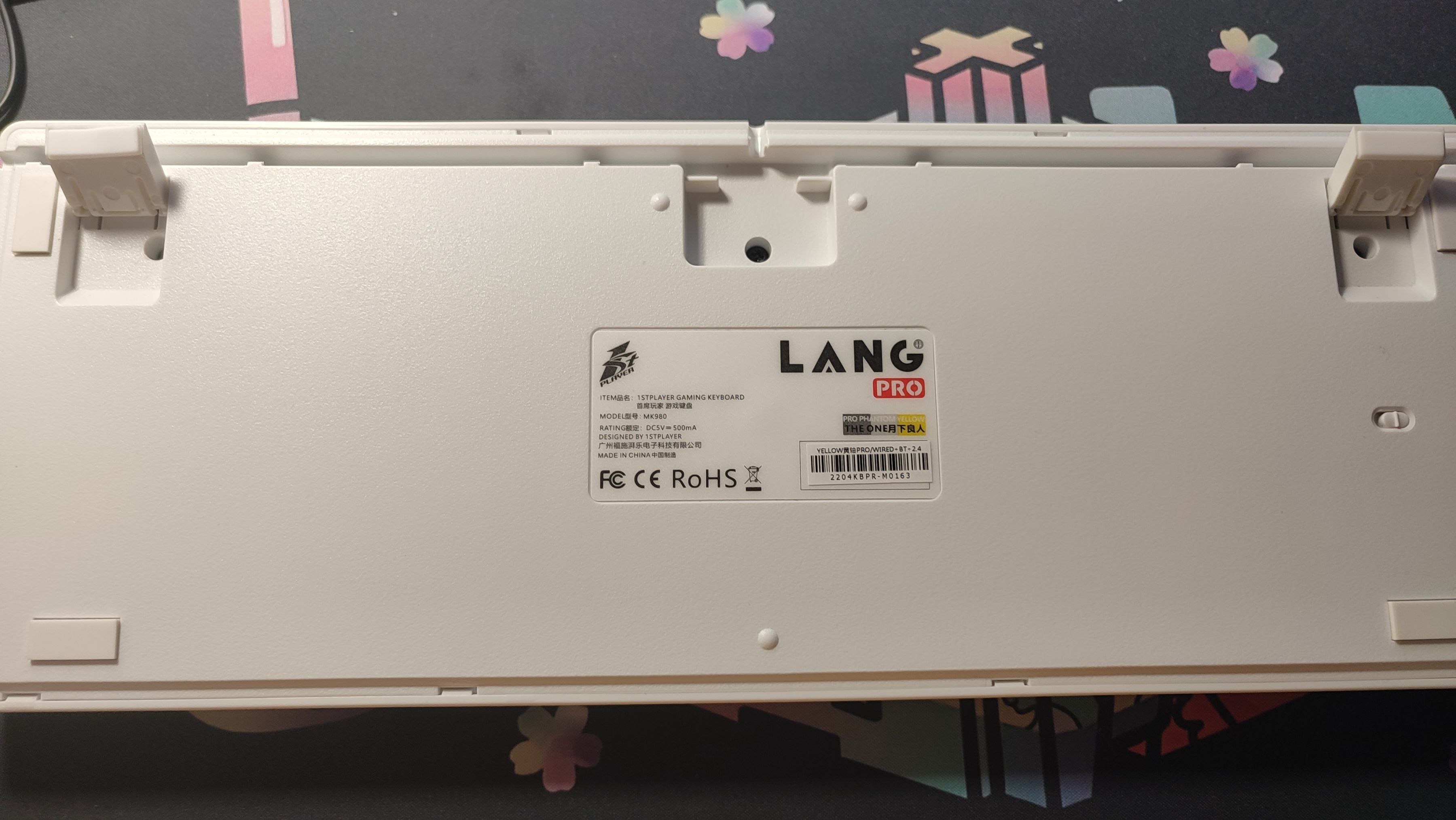 翻到背面,首先映入眼簾的就是中間的貼紙,介紹了一些鍵盤的基礎信息;上方則是三向出線槽,對於這個出線槽,有人喜歡有人厭惡,好處就是使用筆記本的時候或者桌面上線比較多的時候方便整理數據線,壞處就是粗一點的線不容易插進去,而很顯然MK980的這個出線槽很窄,不兼容我的航插線。