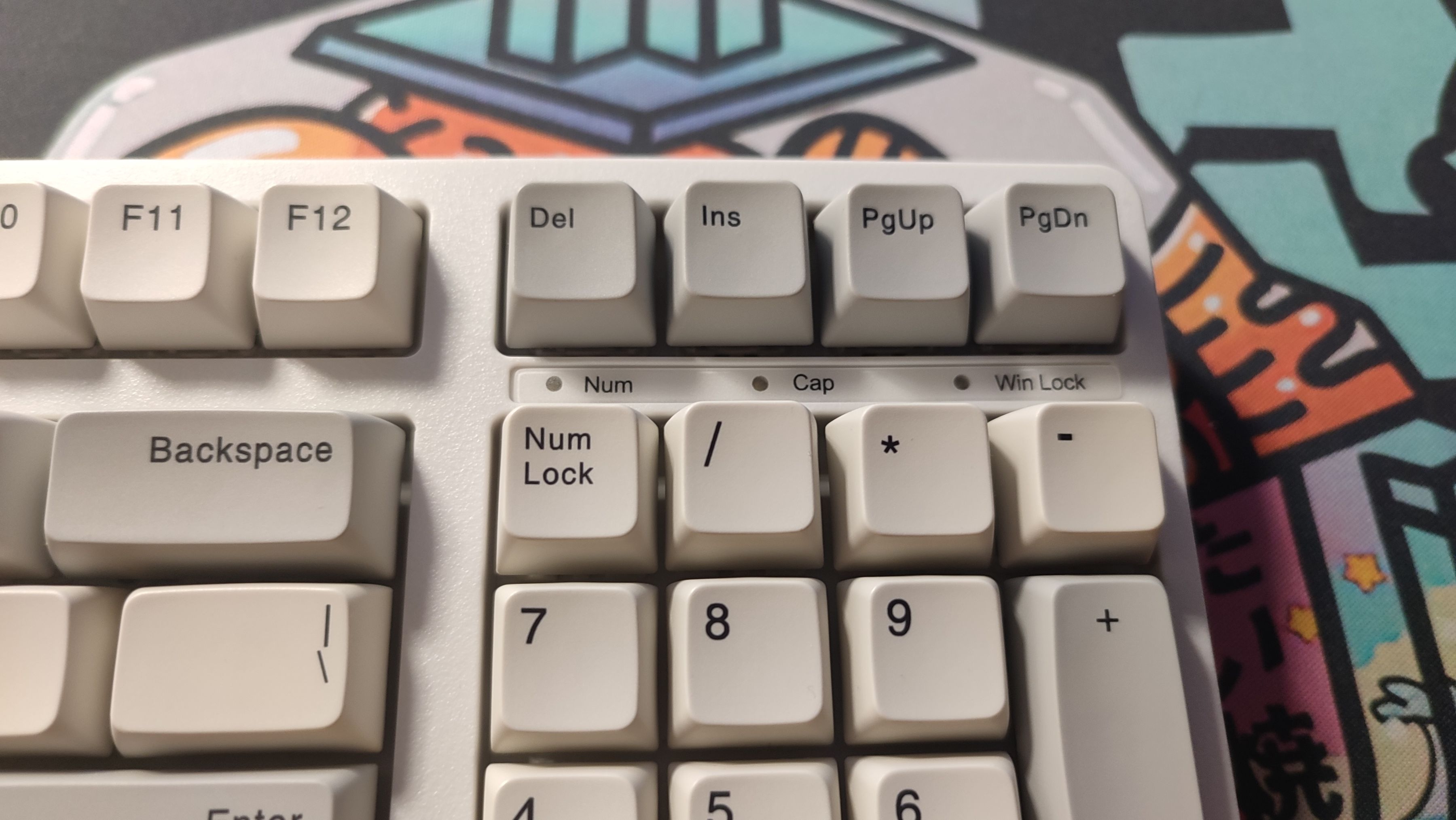 指示燈放到了編輯鍵和數字鍵的空隙中。個人感覺這個位置在日常使用角度會被鍵帽擋住,不太容易看到。
