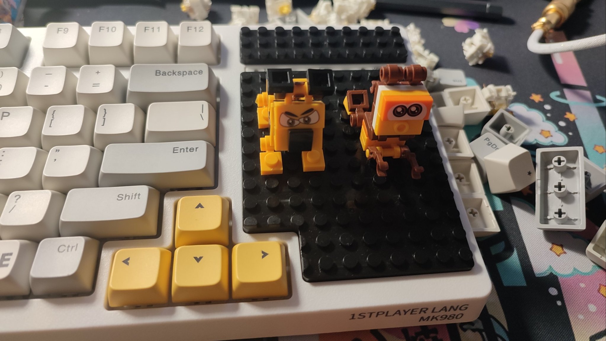 附贈的有兩塊黑色積木板,可以將數字區和數字區上邊的編輯區的鍵帽以及軸體拔掉換成積木板,接着就可以在這兩塊積木板上隨心建造;同時隨鍵盤附贈的有兩盒積木,按照說明書裝好即可