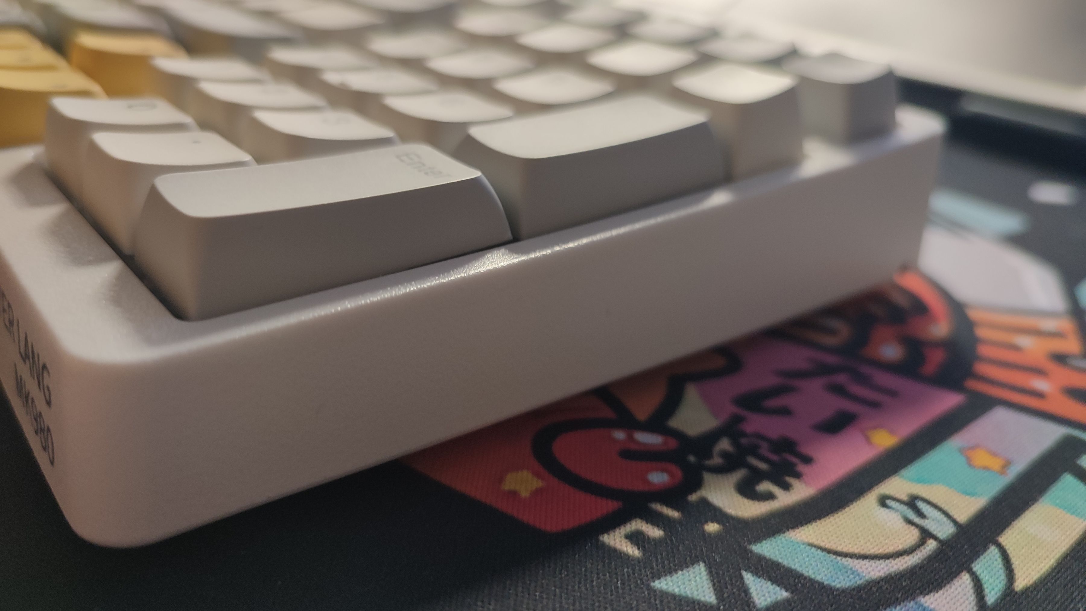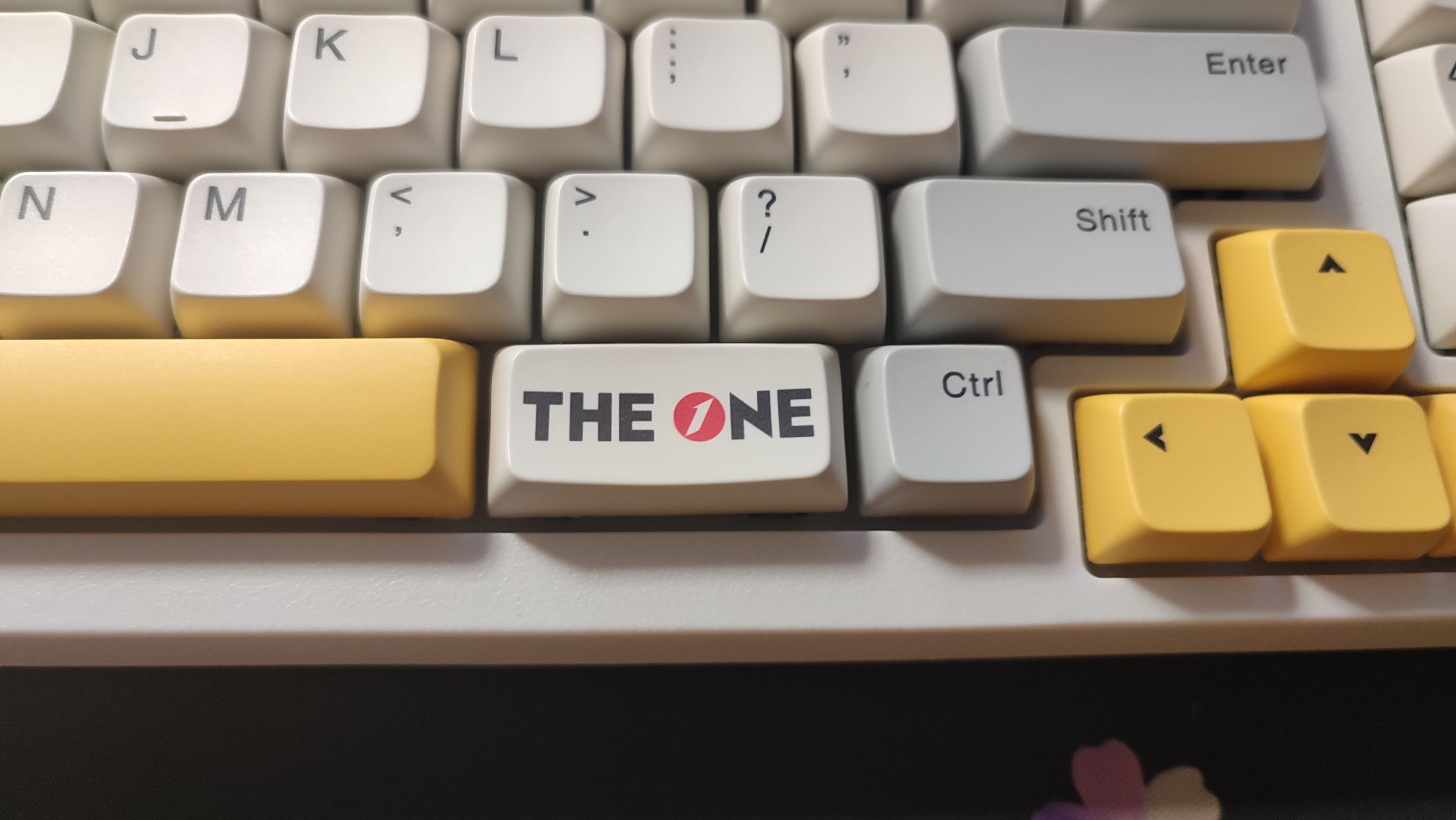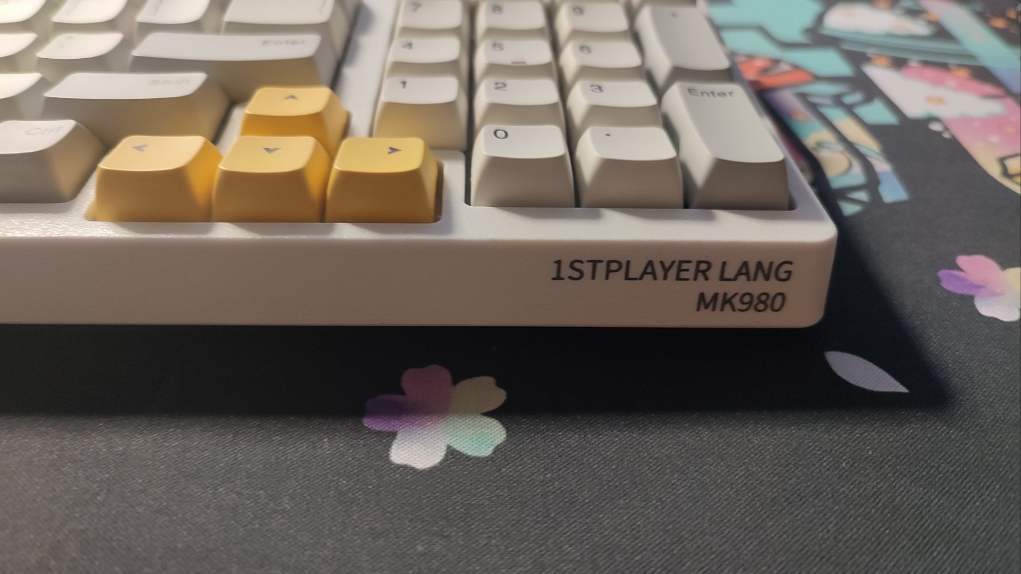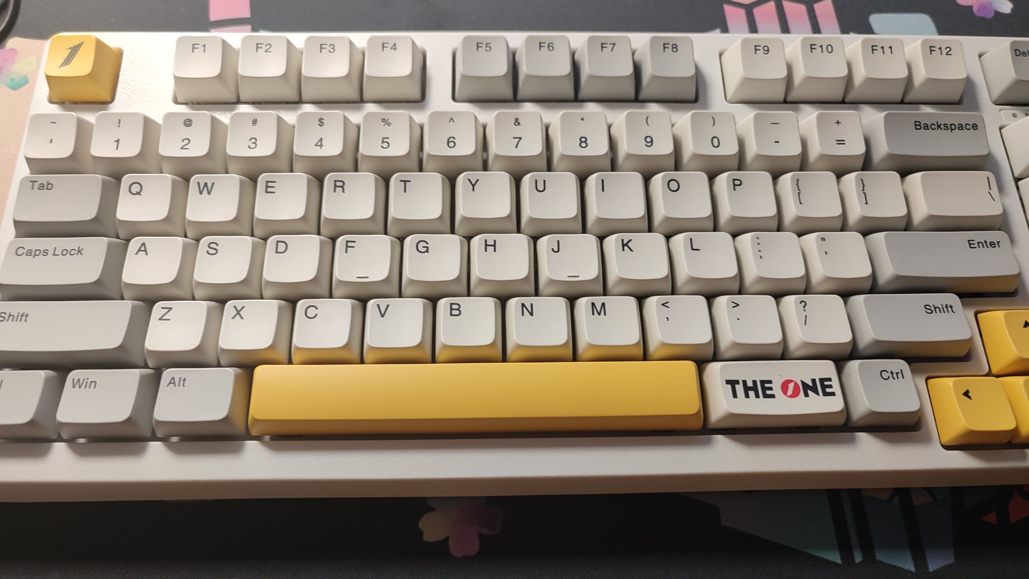 鍵帽整體採用白灰色主題,部分鍵位用黃色點綴,個性鍵“ESC”以及"FN“鍵均可以看出是首席玩家的LOGO;