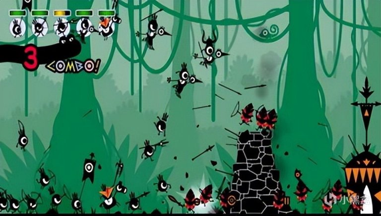 例如啪嗒砰,通过音游模式作为驱动,辅以索尼最擅长的故事剧情,借助极简画风,让一群带着帽子,拿着木棍,单靠一只眼睛来表达情绪的黑色烧饼们演绎一场史诗级的冒险战役,其最吸引人的是,游戏中魔性的节奏感和一定程度的时间差模式,玩家需要预判角色的攻击,以及对手的反应动作,从而打出有效攻击,这就需要玩家全身心代入并有一定的预判能力,这在当时玩家对游戏机角色拥有绝对掌控能力,大家都在拼手速拼熟练的的时代来说,不可谓不是一场新的创新。