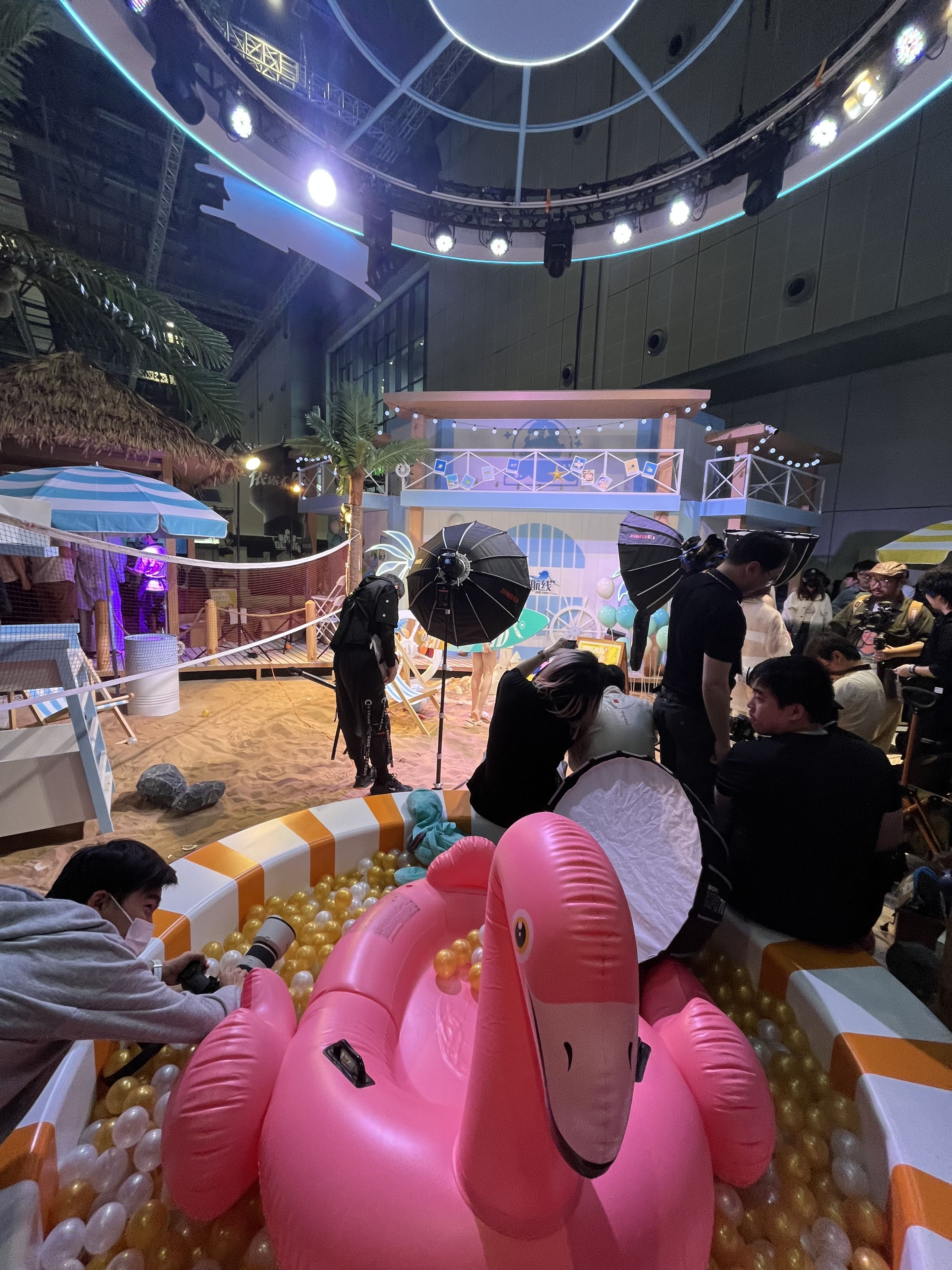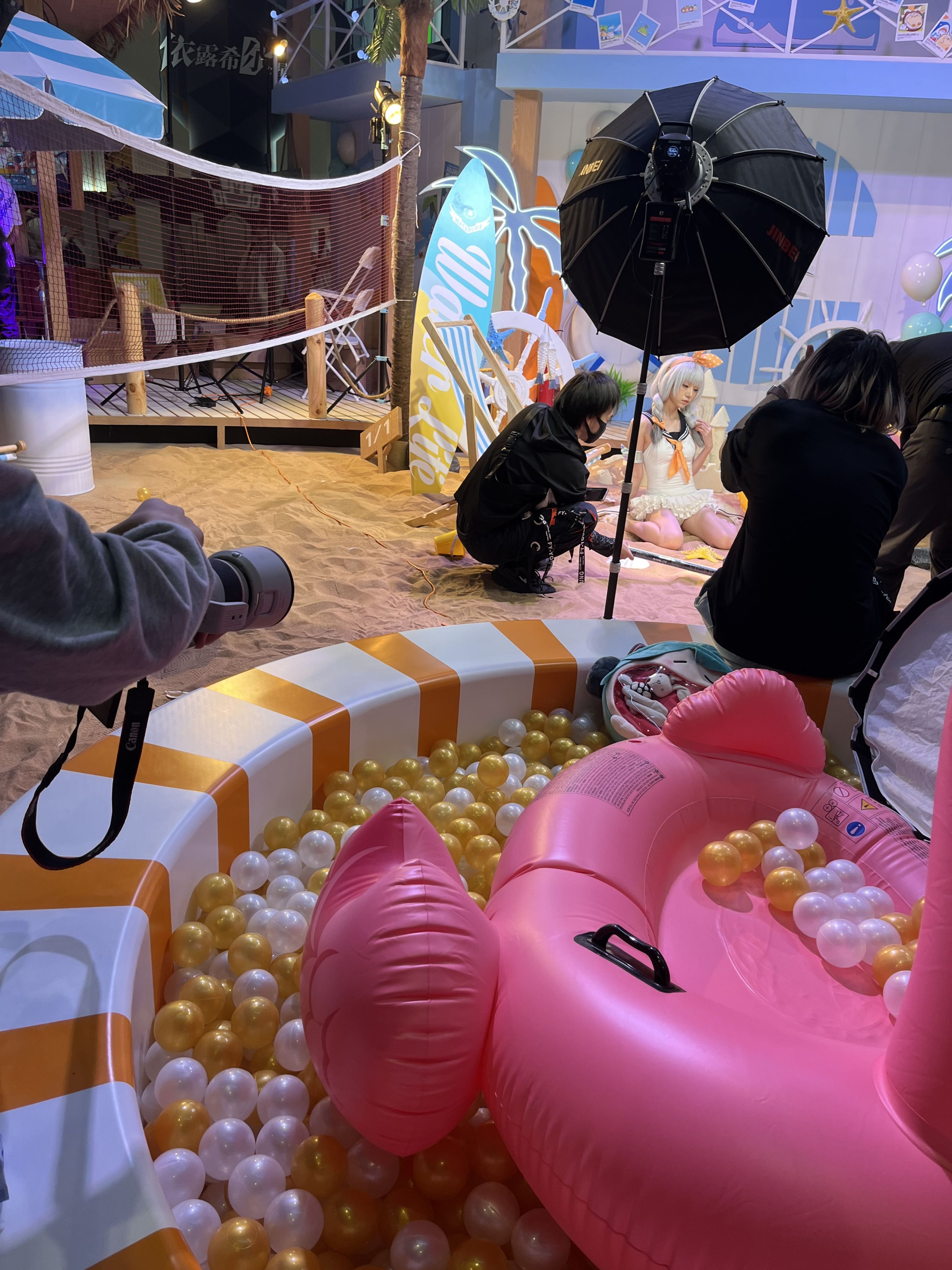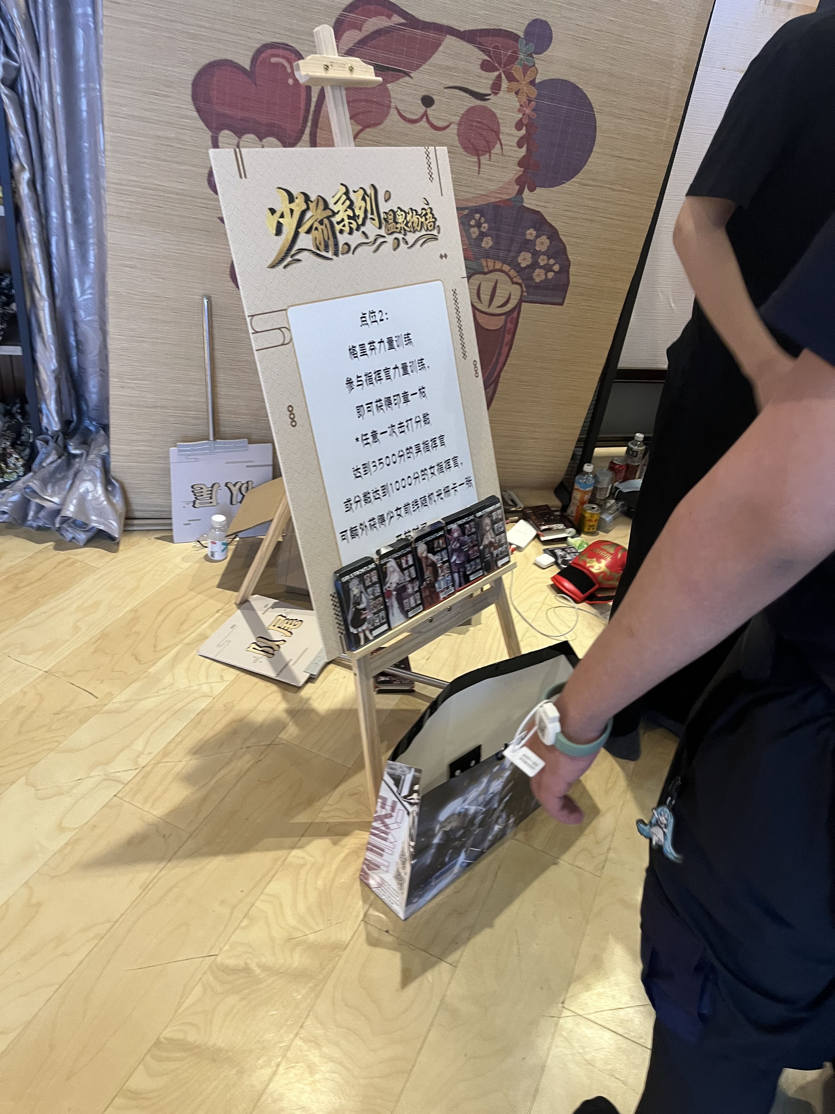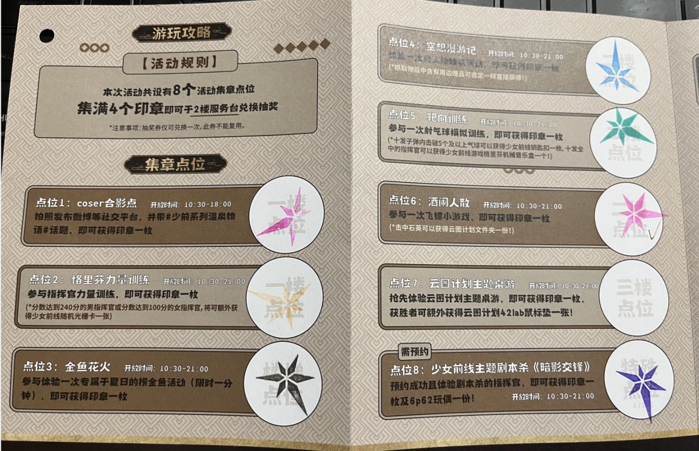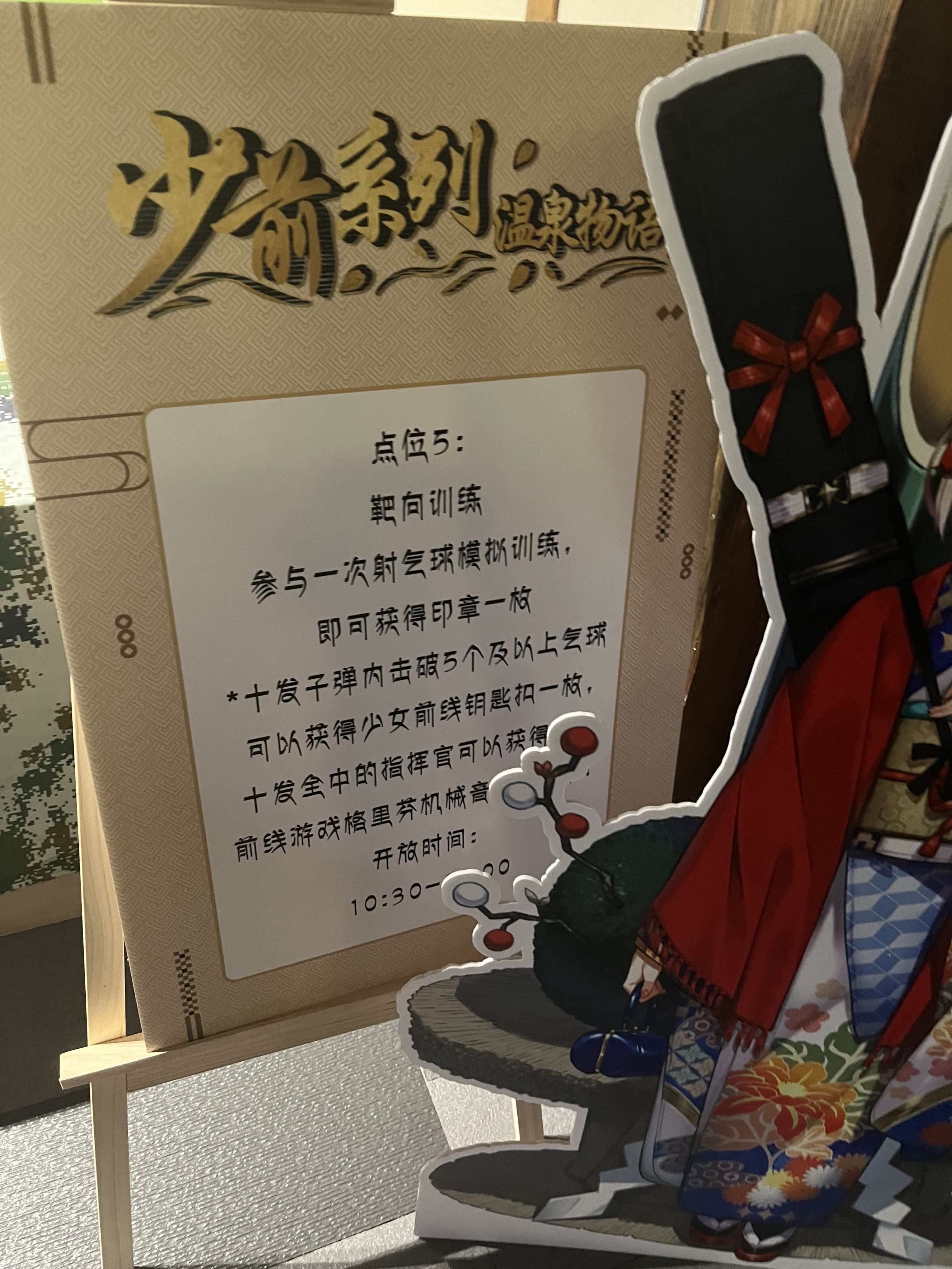 說完浴場設施,再來聊聊二次元聯動活動。除了隨處可見的少女前線角色的巨型立牌和標識外,散爆網絡還爲我們提供了豐富多彩的挑戰和抽獎活動,比如與coser合影並打卡、撈金魚、力量訓練、打氣球、擲飛鏢、劇本殺、桌遊等。