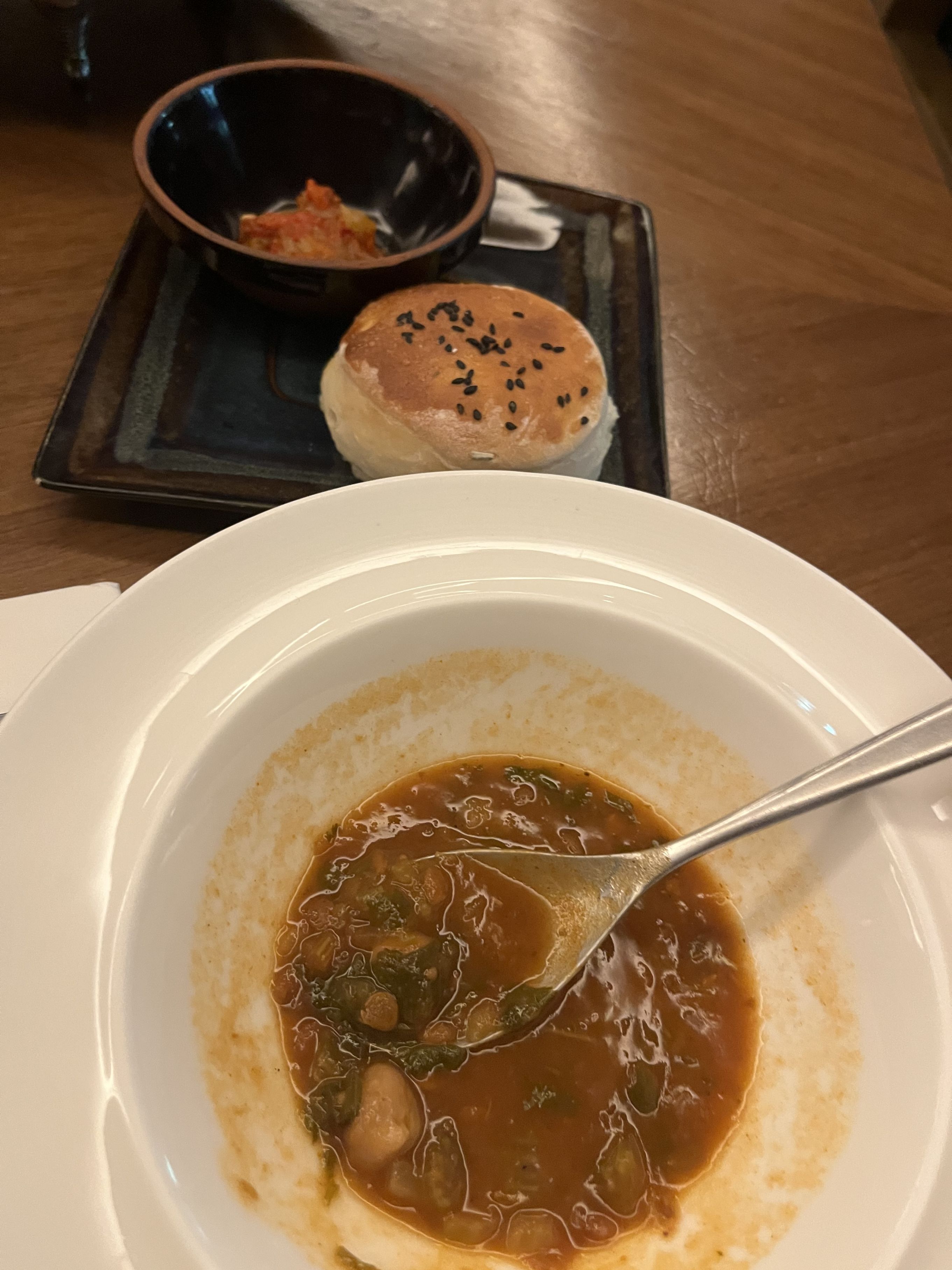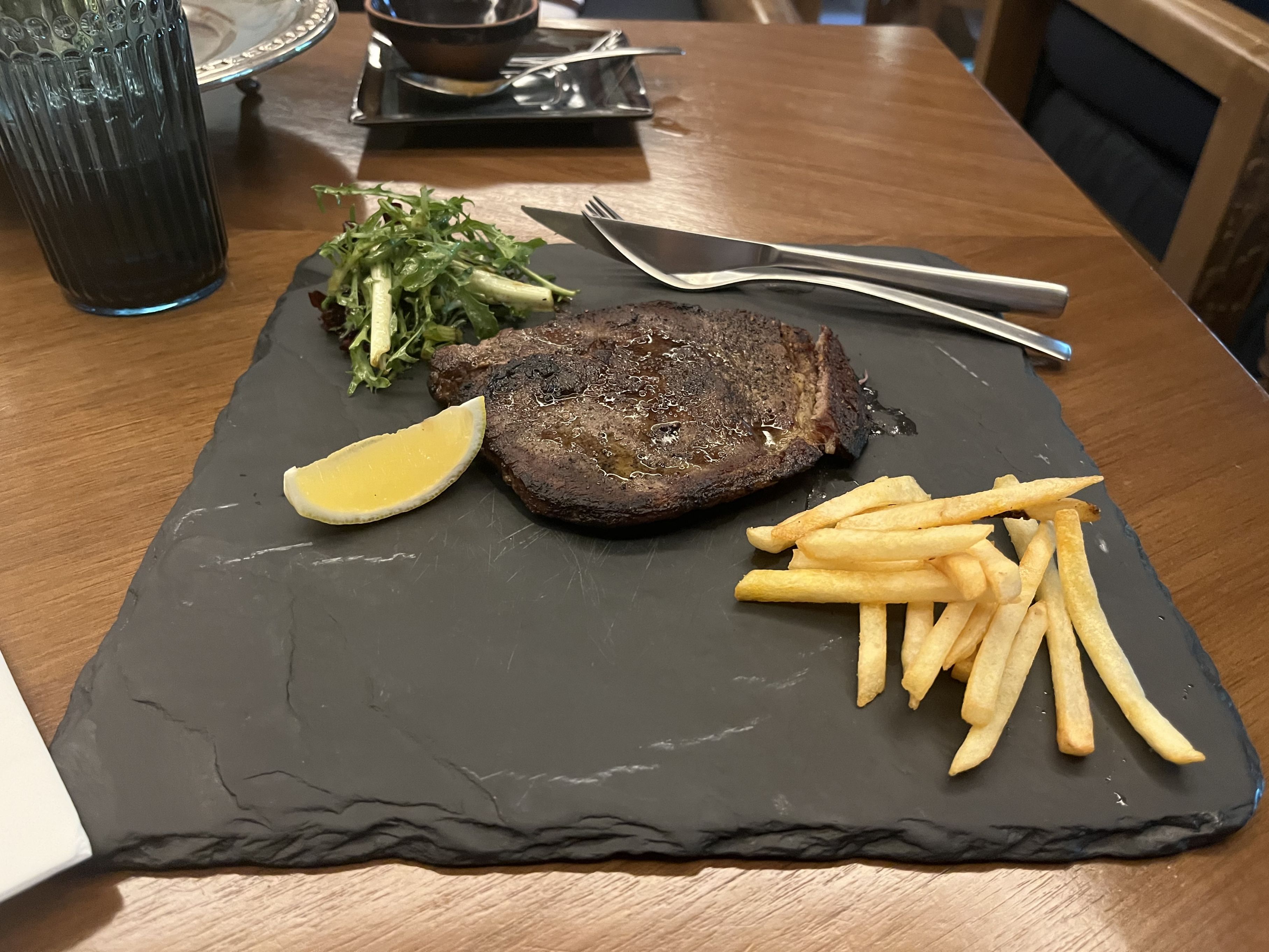 到了十一點左右,我一邊打着哈欠一邊沉吟“大夢誰先覺,平生我自知”,隨後找了三和裏附近的一輛單車,不緊不慢地騎到了揚州老哥們選定的位於外灘繁華地帶的摩洛哥餐廳。不得不說,這家店比較高檔,服務很周到,但價格也比較離譜,一份前湯,一份牛排(加薯條),一份甜點要兩百多,節假日還要按比例收服務費