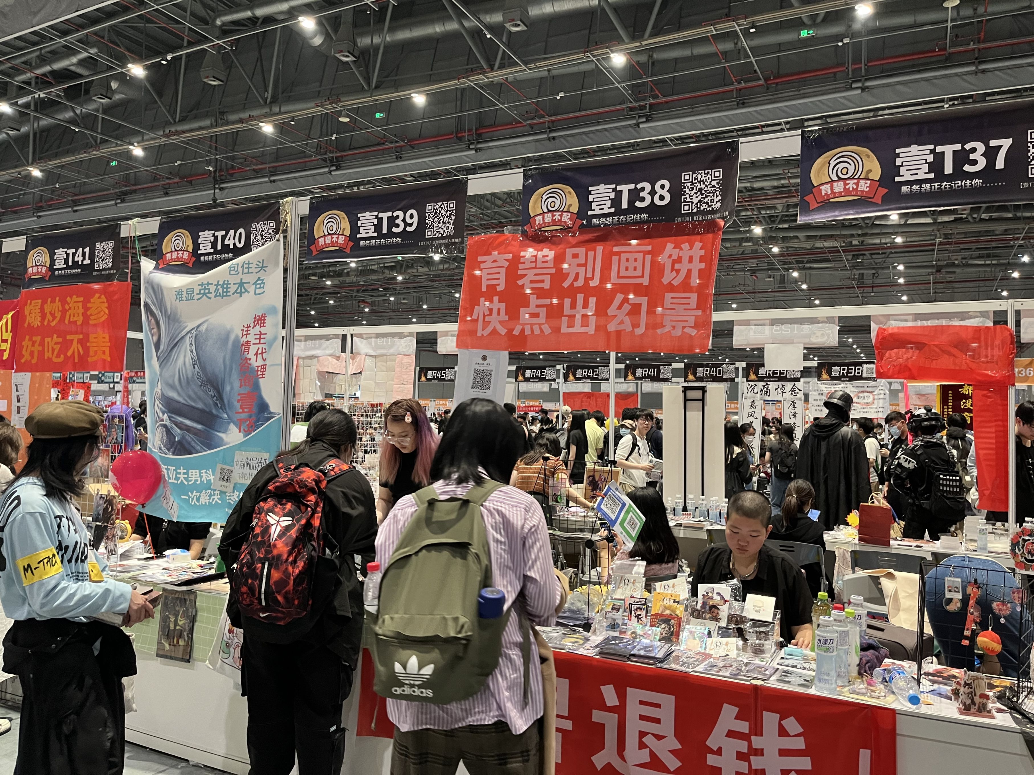 下一站是遊戲同人區,我主要去了育碧、瑞典蠢驢、戰地和擬人軍武(如少前、瓜遊)等攤位,買了刺客信條粉絲自己製作的戴斯蒙、肖恩、李萼等角色同人卡,買了一套“天朝鐵甲戰姬”禮盒(還殺了二十元的價)和一張碧藍航線主題同人鐳射票(本來是衝着插圖集去的,沒想到那個攤位人氣火爆,排了二十分鐘的隊,到我時就沒了)。