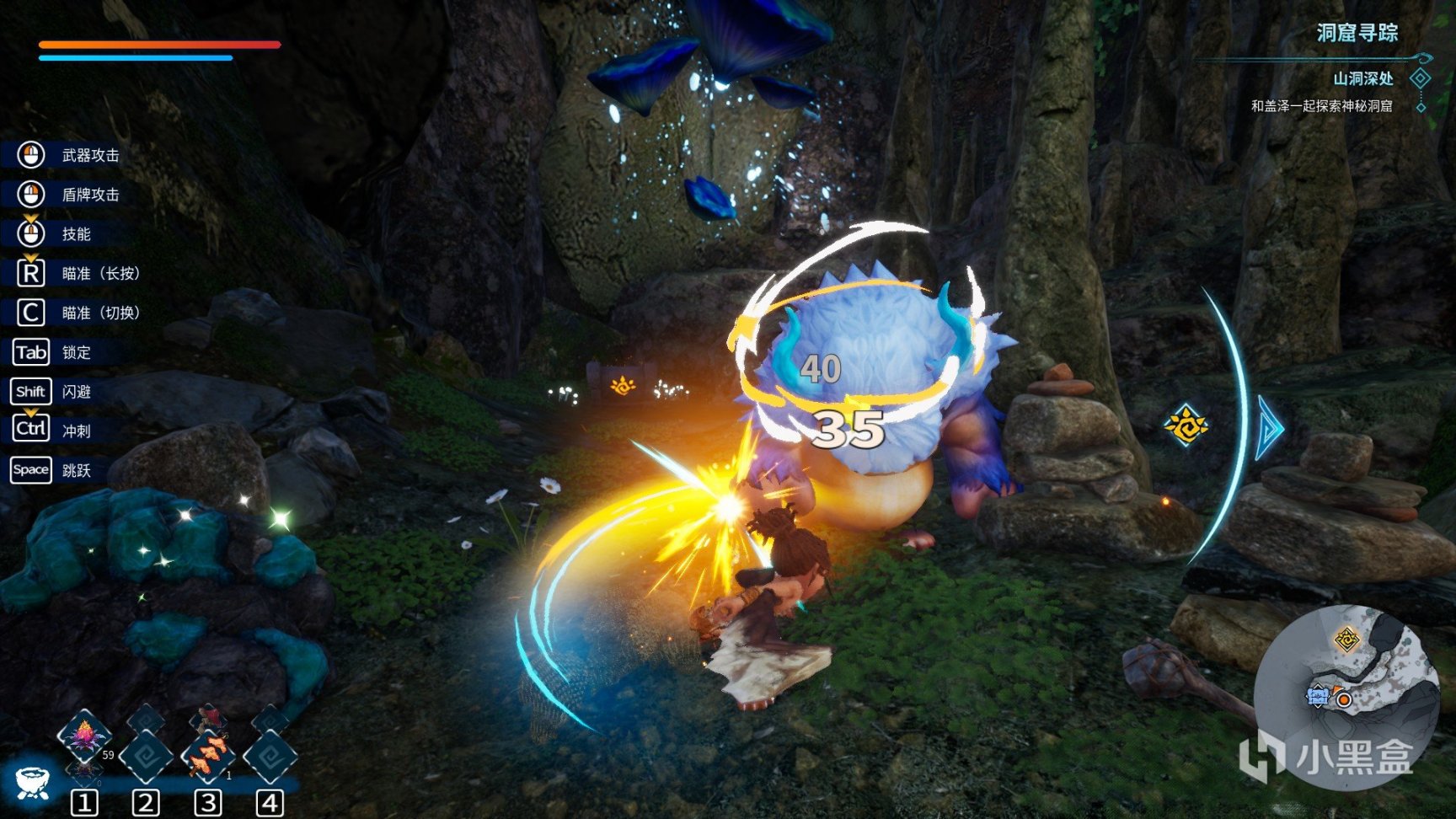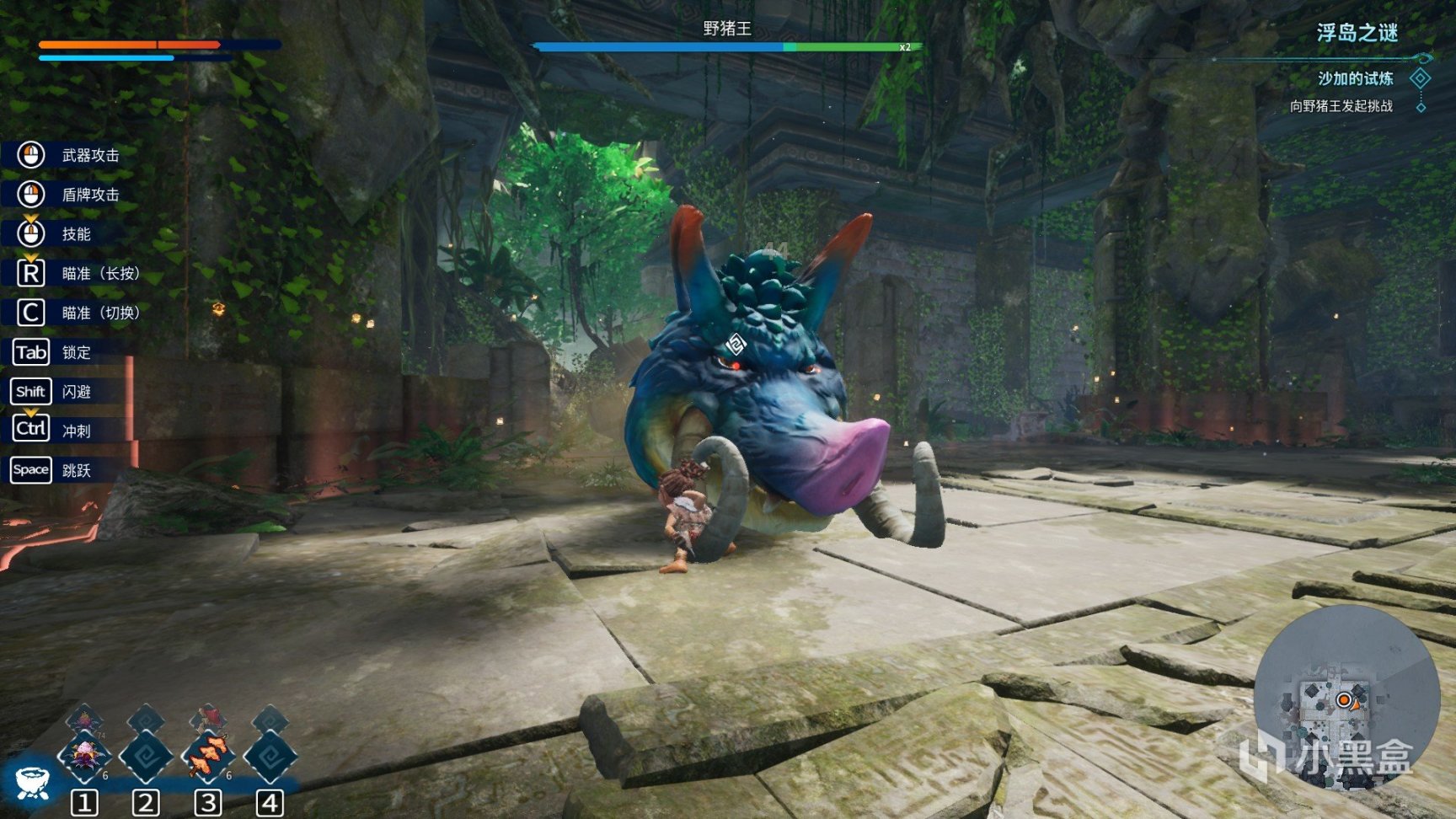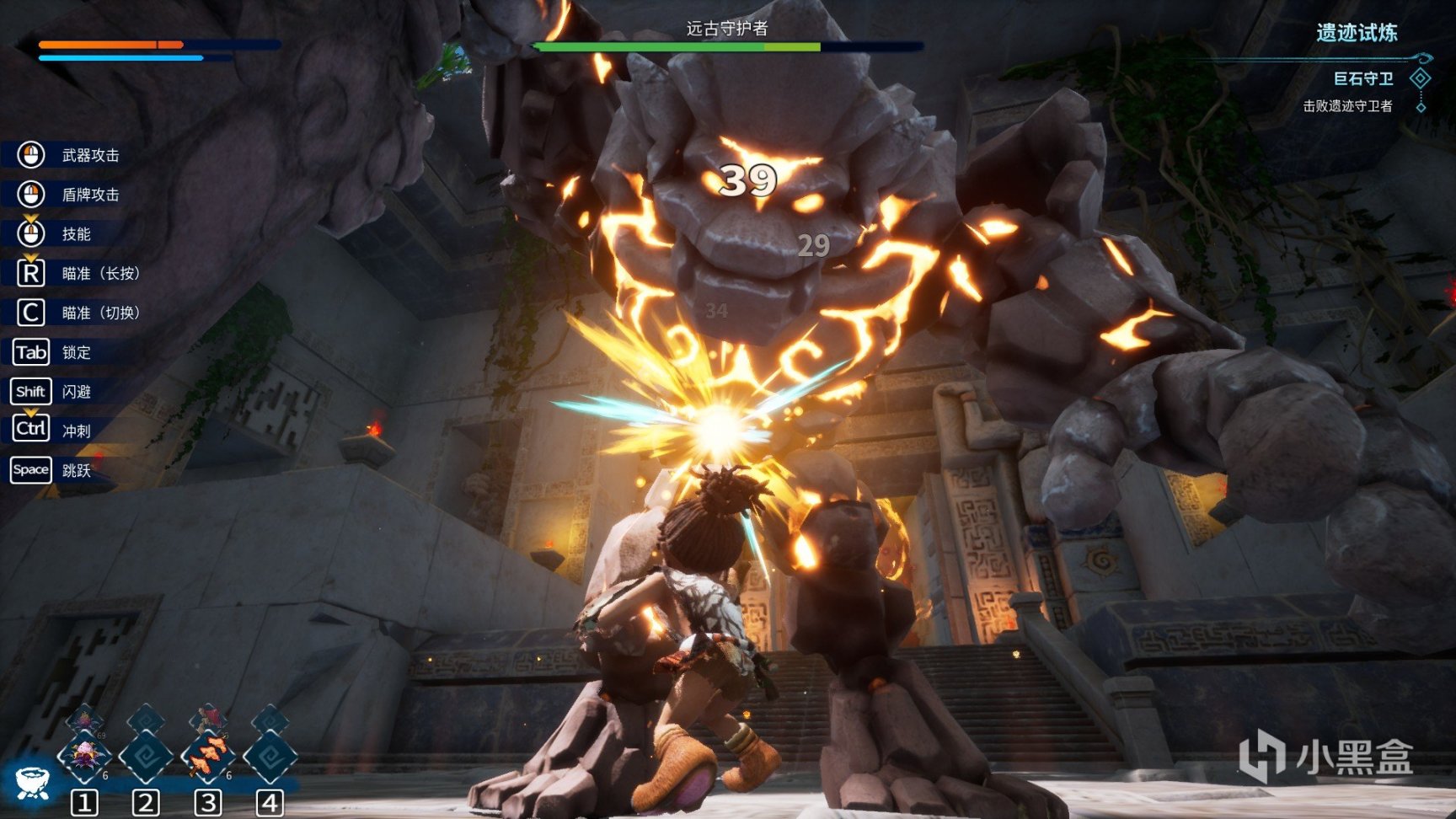 彈弓遠射相較於近戰攻擊只能說是一種輔助手段,本作中玩家最重要的戰鬥方式是近戰。近戰在本作中被設計爲劍盾攻擊的形式,玩家可以使用鼠標左鍵的劍(其實也不算劍就是了,但也屬於近戰揮砍武器,姑且這麼稱呼了)來進攻,也能用鼠標右鍵的盾牌對敵方進行猛擊。前者凌厲,是主要的傷害輸出方式;後者厚重,能以盾牌猛擊將體型不大的敵人直接眩暈住,非常實用的控制手段。靈活利用這兩者就可以應付很多戰鬥了,但遇到BOSS還是得注意BOSS的行爲邏輯。