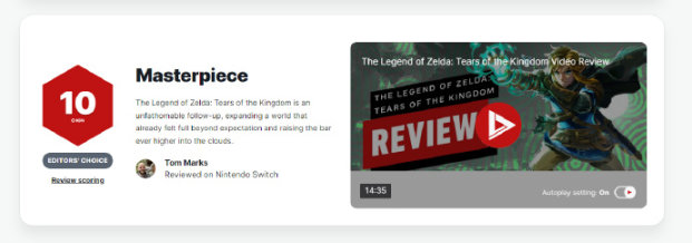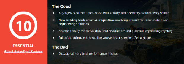 以下则是选取几家著名游戏媒体对《塞尔达传说:王国之泪》评测: