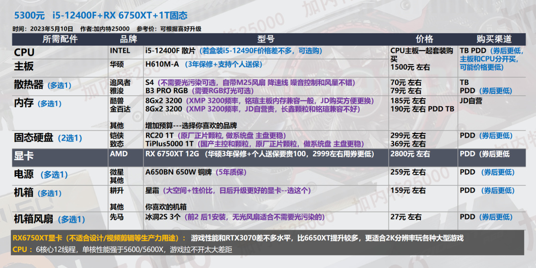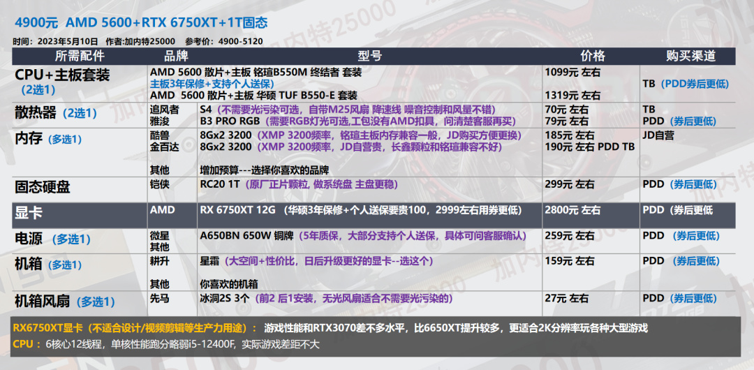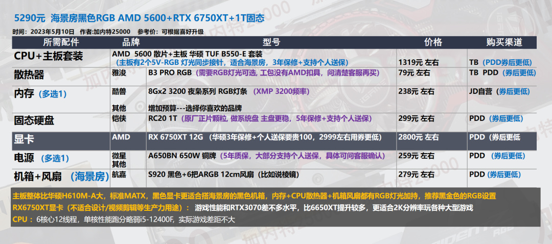 显卡RX6750XT 3套配置推荐,性价比选4900这套,对外观有要求的选5290海景房RGB配置