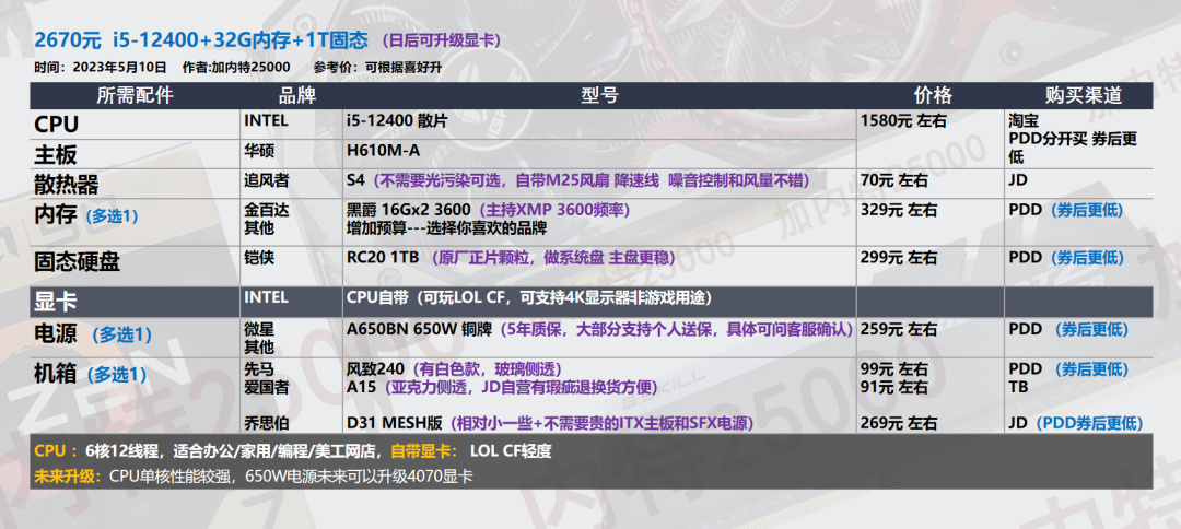 第2套 CPU i5-12400,满足家用/办公的大部分场景,650W电源,留足了未来升级显卡的空间。