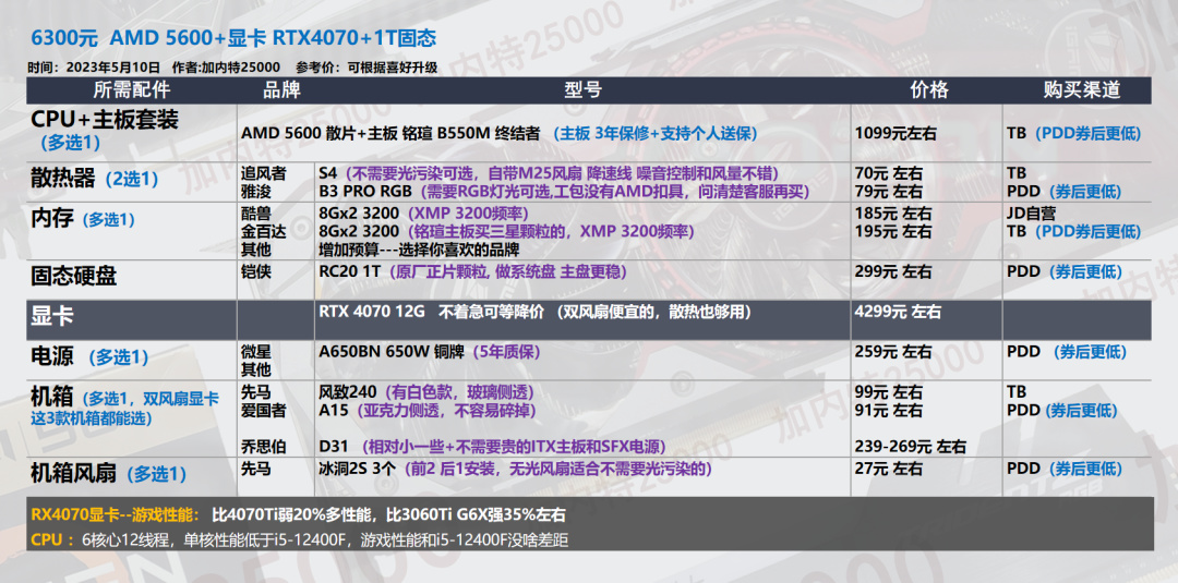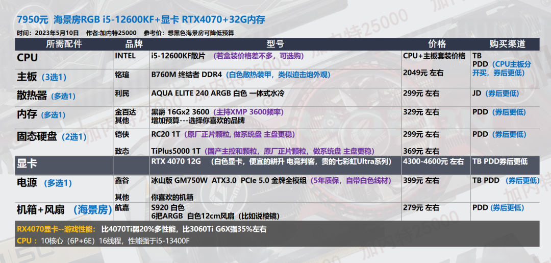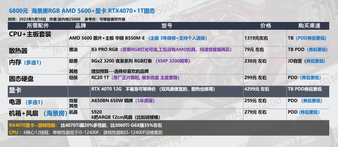 6300和6800的这两套性价比高一些,玩3A为主很适合,白色海景房RGB方案可参考最后i5-12600KF 4070那套配置。