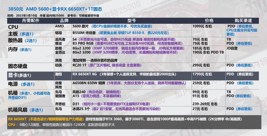 对于预算紧张的朋友,一般是能省一点是一点,所以这次推荐,将RX 6650XT显卡配置,价格最低压到了3500左右。