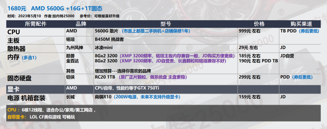 第1套 AMD CPU 5600G,CPU自带显卡的游戏性能大概有GTX750Ti水平,可以畅玩LOL 原神