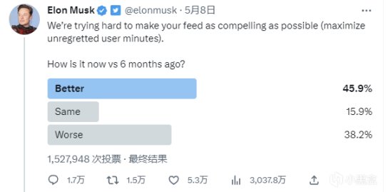 5月8日,马斯克发起一项投票,“与六个月前相比,现在的推特如何?”在150万投票者中,有约46%的人对此认为是“变得更好了”,有38%的人认为“变得更糟”,这样的“好评率”也给予了马斯克继续改造推特的信心。