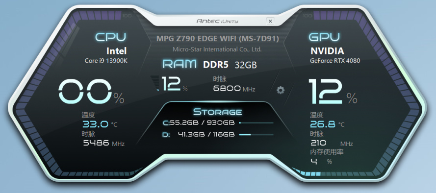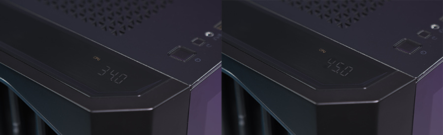前面板頂部位置還有一塊數顯屏幕,通過機箱的USB 2.0線材將屏幕連接至主板後,搭配上安鈦克推出的iUnity監控軟件,可以將處理器和顯卡的溫度實時顯示在機箱上方,也可以直接在系統中查看處理器、顯卡、內存、硬盤等硬件的溫度、頻率、佔用率等信息;