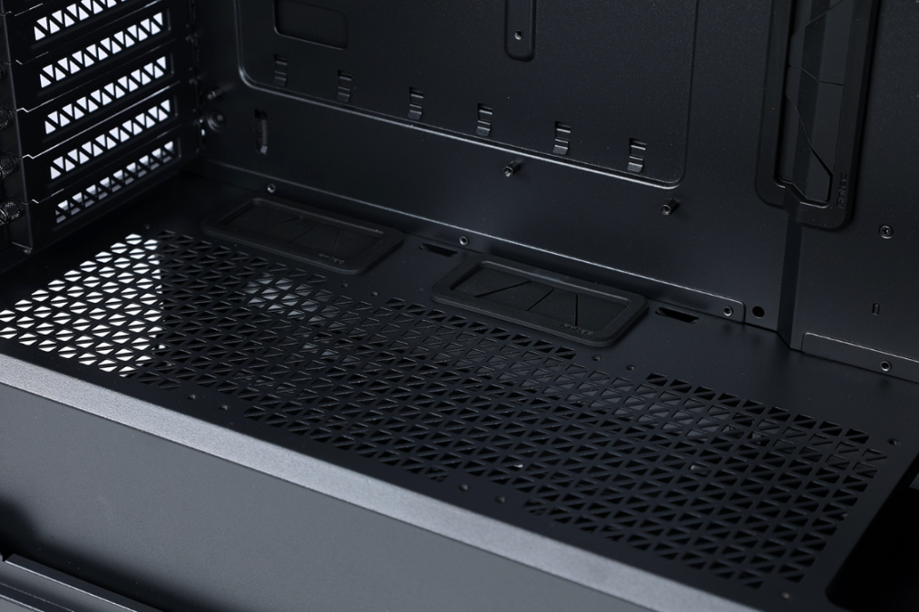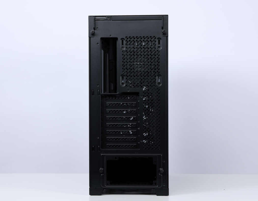 機箱尾部同樣配備大量三角形散熱開孔,而8個橫置PCIE 槽位也讓整個機箱可以裝下更多的PCIE設備;