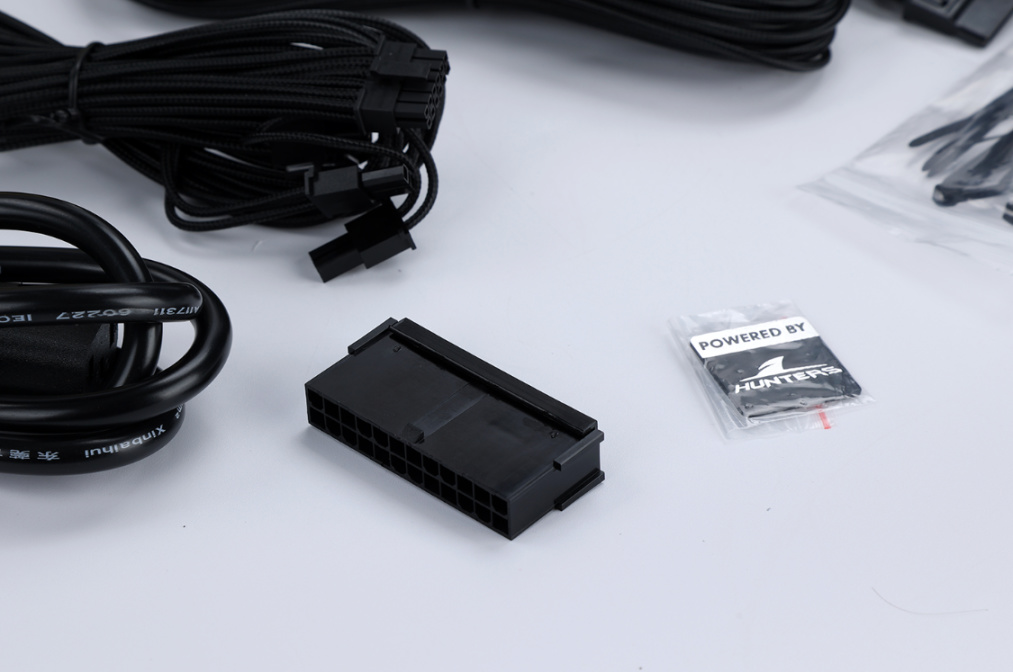 線材方面,電源標配1根24Pin主板供電線、2根4+4Pin處理器供電線、1根12VHPWR轉12VHPWR顯卡供電線、2根12VHPWR轉6+2Pin的一拖二顯卡供電線、2根6+2Pin的一拖二顯卡供電線、2根大4D供電線、以及1根SATA供電線。同時電源還附贈了一塊24Pin短接接口和1塊獵人部落LOGO金屬銘牌;(編織線必須給個好評)