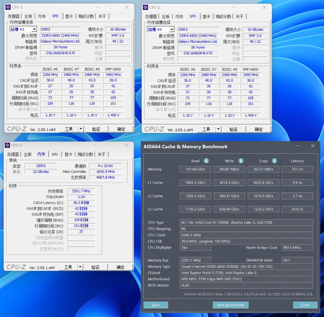 內存讀寫測試,直接開啓XMP,內存讀取速度爲101.68 GB/s,寫入速度爲89387 MB/s,複製速度爲92721 MB/s,延時爲70.5ns;