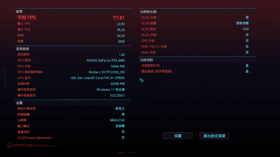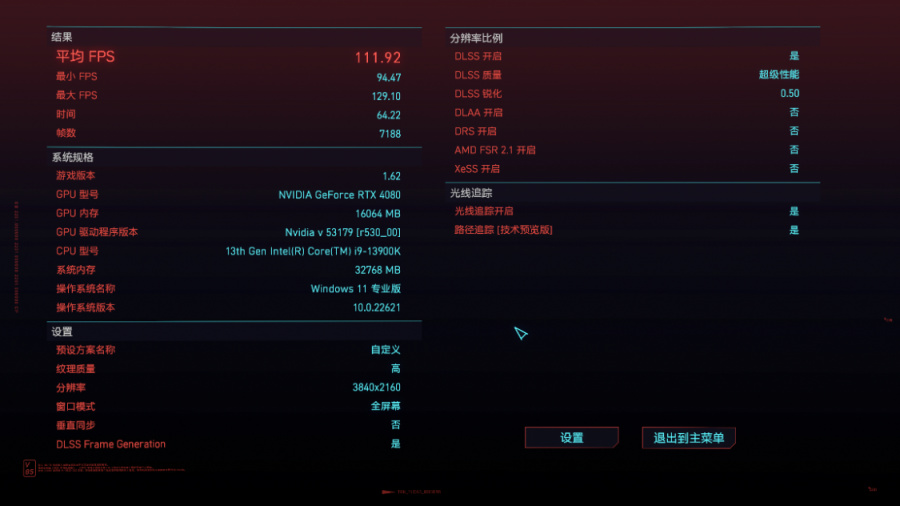 《賽博朋克2077》,畫質超級,光追變態,4K分辨率下,關閉DLSS時,遊戲平均幀率爲26.99FPs,開啓超級性能模式下的DLSS 2.0後,遊戲平均幀率爲109.39FPS,繼續開啓DLSS 3.0後,遊戲平均幀率爲142.12FPS;
