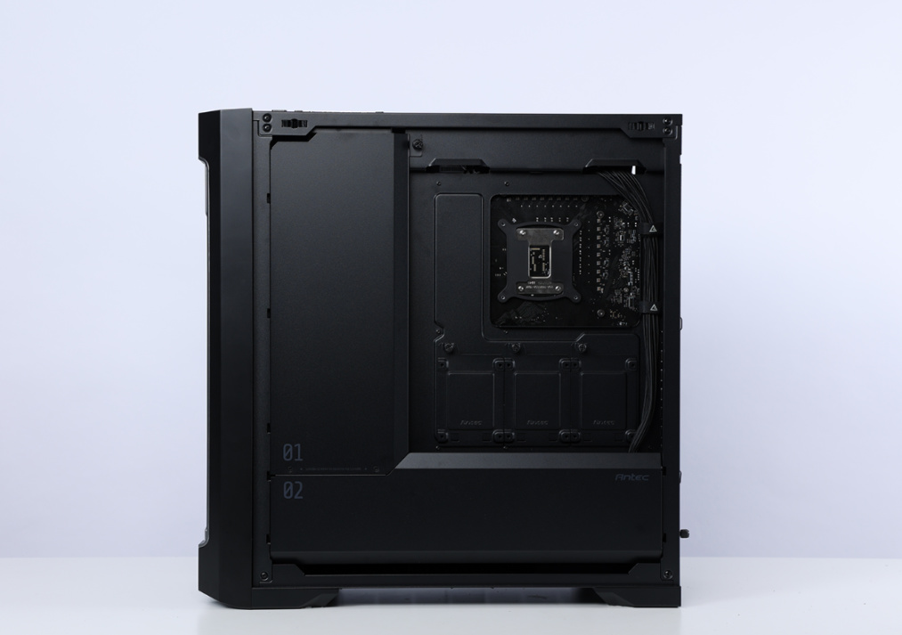 取下金屬蓋板,可以看到整個機箱將所有線材的走線方向都集中在了背部的左側區域,兩塊大孔徑過線孔可以輕鬆穿過24PIN主板供電接口,過線孔四周還都配備了軟質橡膠圈,既可以遮住背部走線美化線材,還可以避免機箱金屬板材劃傷供電線的問題。機箱電源倉處的兩處過線孔也都配備了軟質橡膠圈進行保護;
