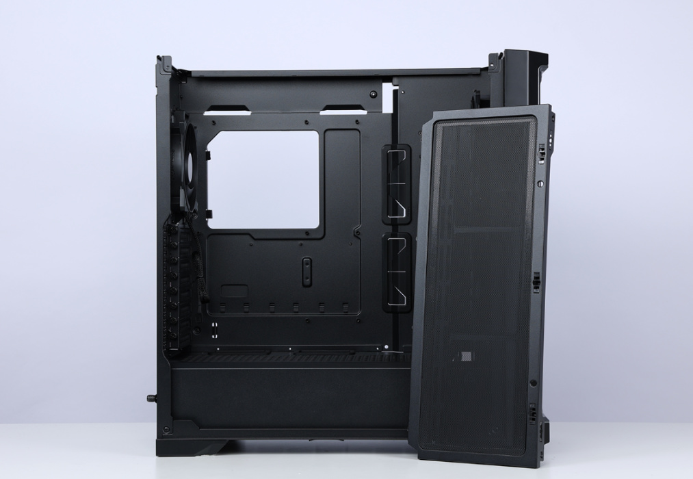 前面板拆卸十分簡單,磁吸 + 插銷的固定方式大大降低了清灰維護的難度。機箱前面板處標配了3把140mm風扇,尾部則附贈了1把120mm規格的風扇。與常規的風扇不同,機箱標配的風扇厚度均爲30mm,搭配上高轉速軸承和9片流線型扇葉以及機箱表面的大面積開孔設計,可以提升機箱內部的散熱效率,加快機箱內熱量排出;