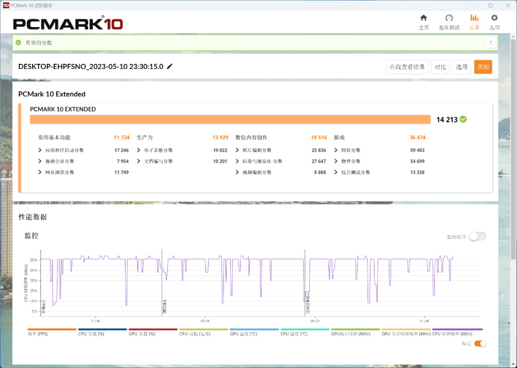 PC Mark Extended整機測試,整機得分14213分,常用基本功能得分11724分,生產力得分13929分,數位內容創作得分18516分,遊戲得分36474分;