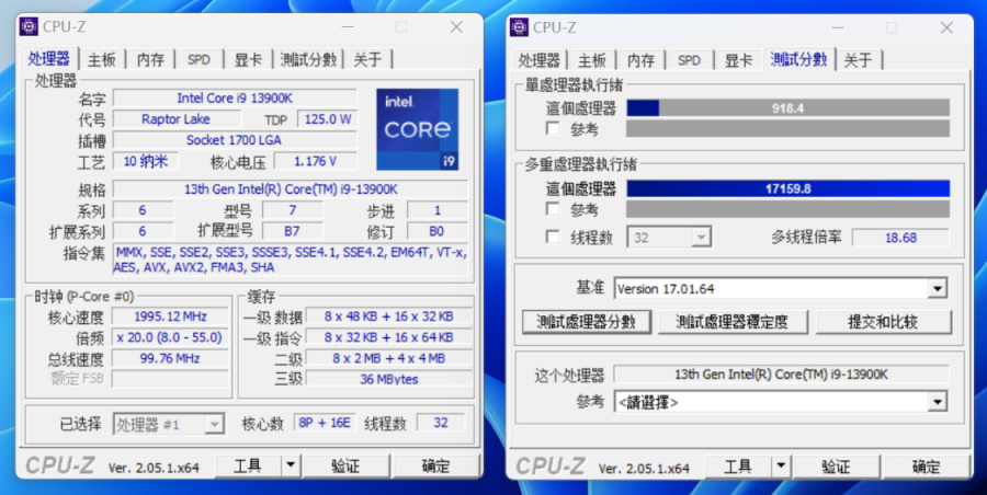 CPU-Z基準測試,單核得分918.4分,多核得分17159.8分;