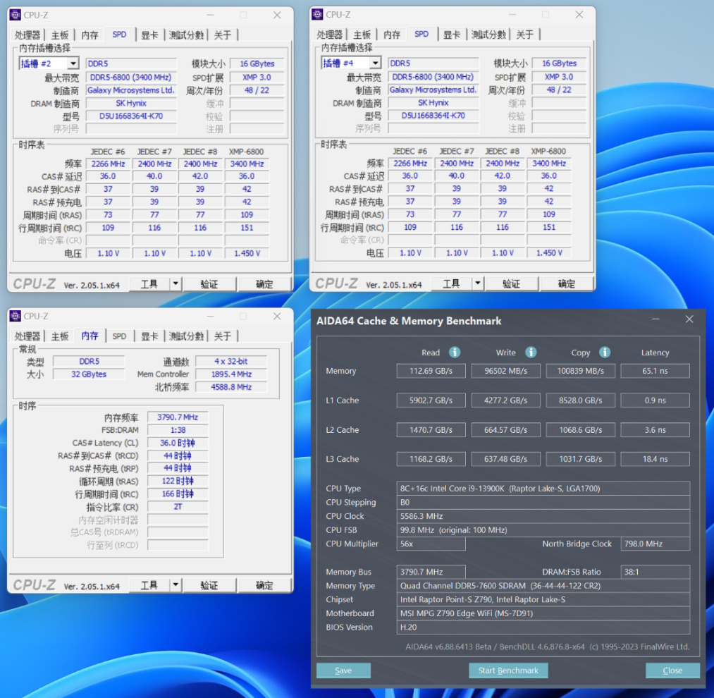 繼續將內存頻率OC至7600MHz,內存讀取速度爲112.69 GB/s,寫入速度爲96502 MB/s,複製速度爲100839 MB/s,延時爲65.1 ns;