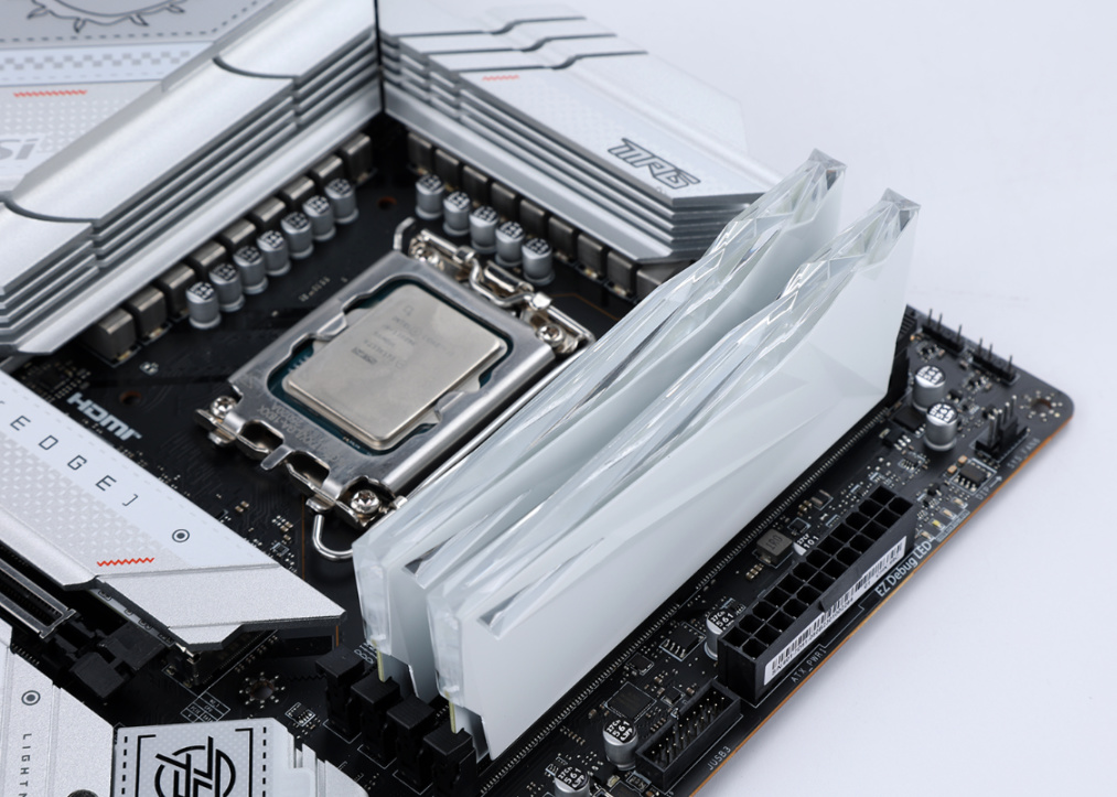 D5內存在時下來講,也不是啥稀罕物件了,但是超級能超的a-die顆粒還是真香無疑。本次裝機選擇的是星曜DDR5-6800MHz 16G*2內存,能OC到多少我保證不了,但是在今天這塊主板上,其實最穩妥的應該是7200MHz。除了強悍的性能,顏值方面,白色PCB搭配白色金屬散熱馬甲,再加上ARGB燈效,愛了愛了。