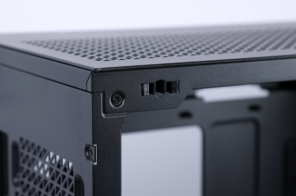 機箱鋼化玻璃側板採用球形卡扣 + 卡槽的固定方式,便於機箱拆裝,尾部還配備了一顆手擰螺絲加固。旁加還有個小把手,非常貼心;機箱頂部,大面積的三角形散熱網孔設計,也能更好的保證機箱內部熱風排出。