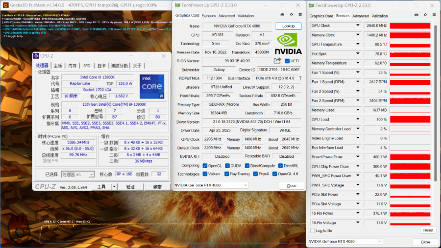 FurMark顯卡烤機測試,烤機15Min+,顯卡溫度61°左右,顯卡功耗則在400W左右;